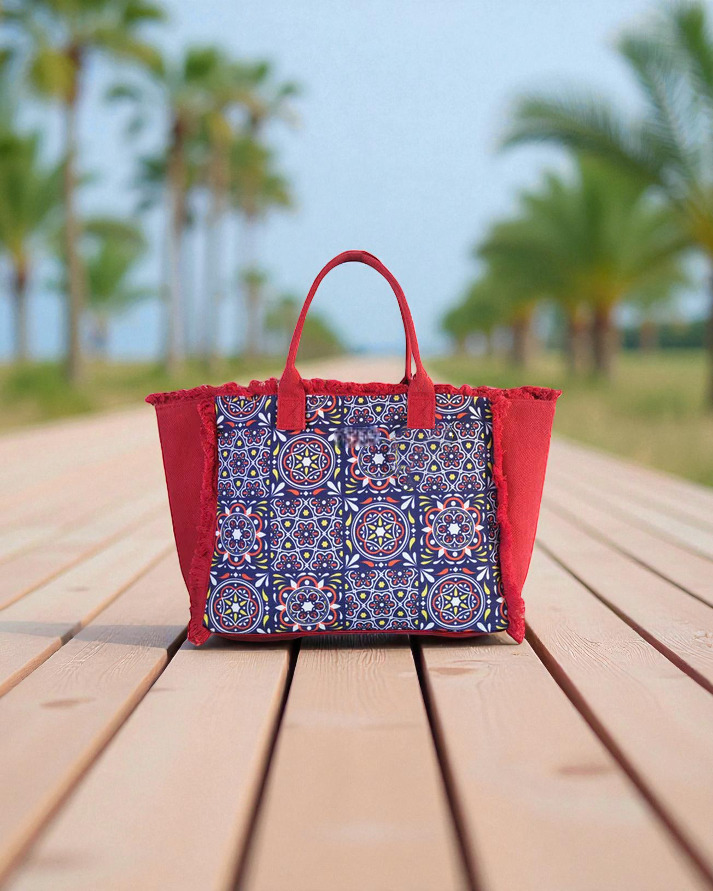 Diseño, confección y tela italiana. Bolso tipo shopper elaborado en tela resistente con diseño estampado. Cuenta con asas de mano firmes y detalles en los bordes con acabado deshilachado que le aportan un toque artesanal. Amplio y ligero, ideal para el uso diario o para llevar a la playa o de paseo.