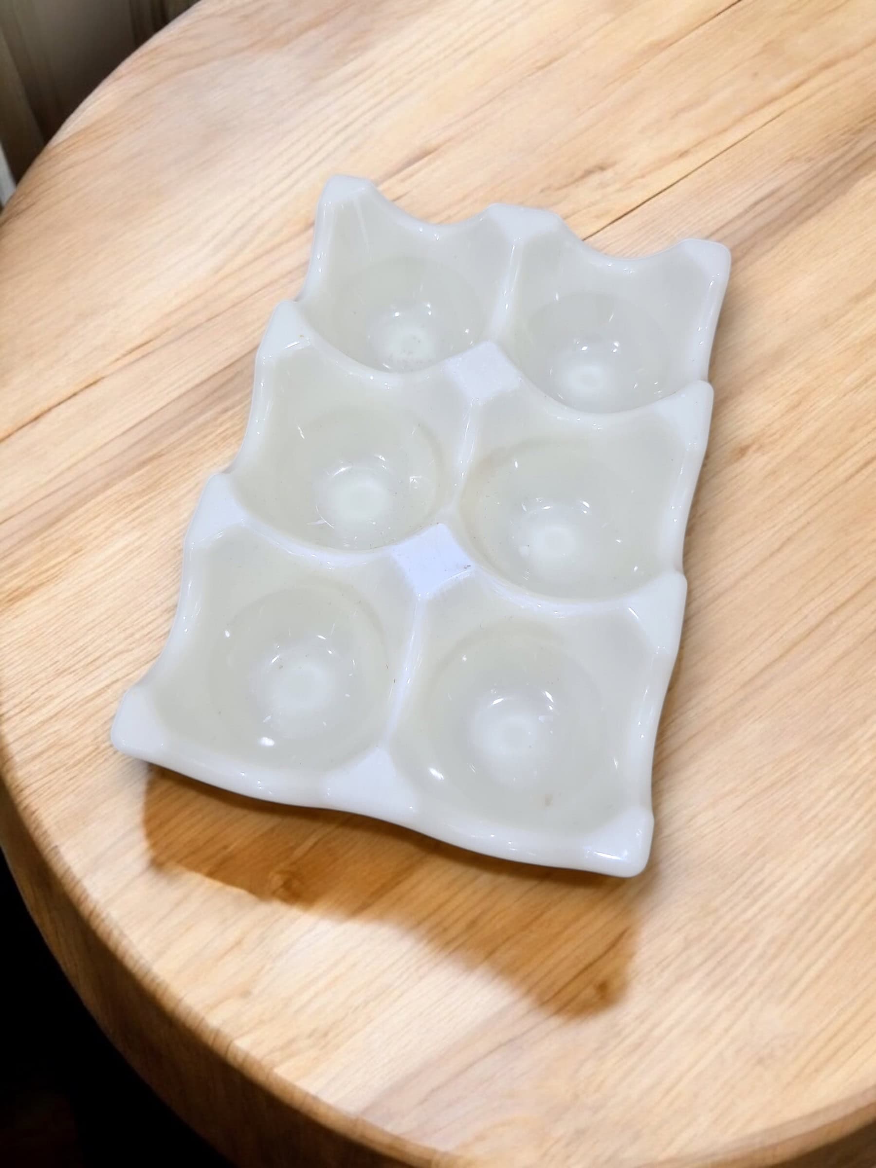 Porta huevos para media docena con diseño de silueta ondulada y acabado de alto brillo. Cada cavidad sostiene el huevo con estabilidad, aportando un toque decorativo y moderno. Ligero, duradero y fácil de limpiar.