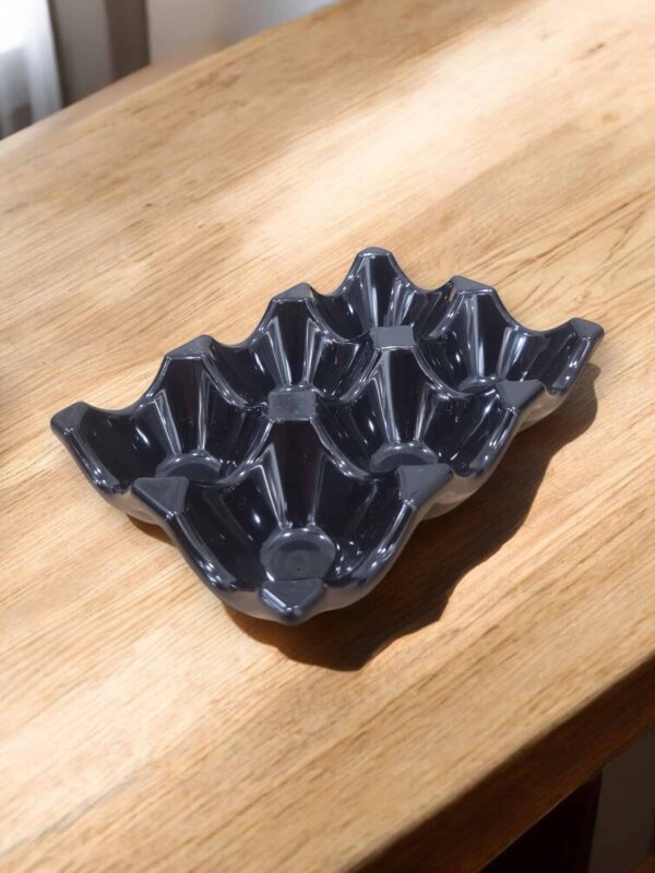 Porta huevos para media docena con diseño de silueta ondulada y acabado de alto brillo. Cada cavidad sostiene el huevo con estabilidad, aportando un toque decorativo y moderno. Ligero, duradero y fácil de limpiar.