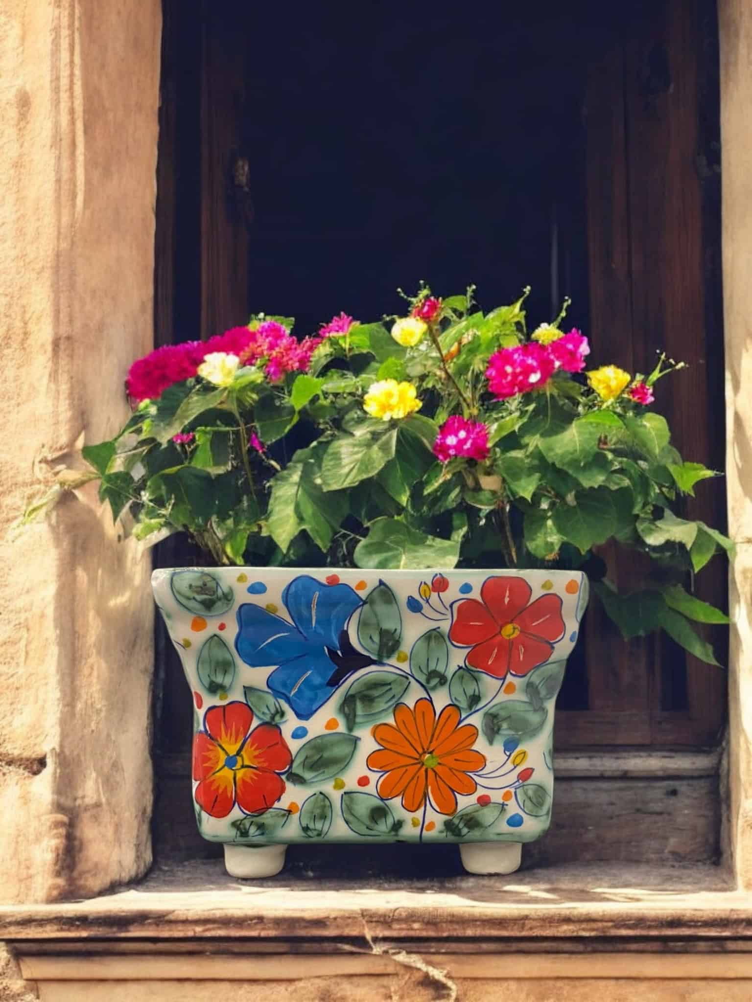 Maceta cuadrada de cerámica hecha y pintada a mano por artesanos limeños. Ideal para orquídeas, plantas aromáticas, plantas de temporada, etc.