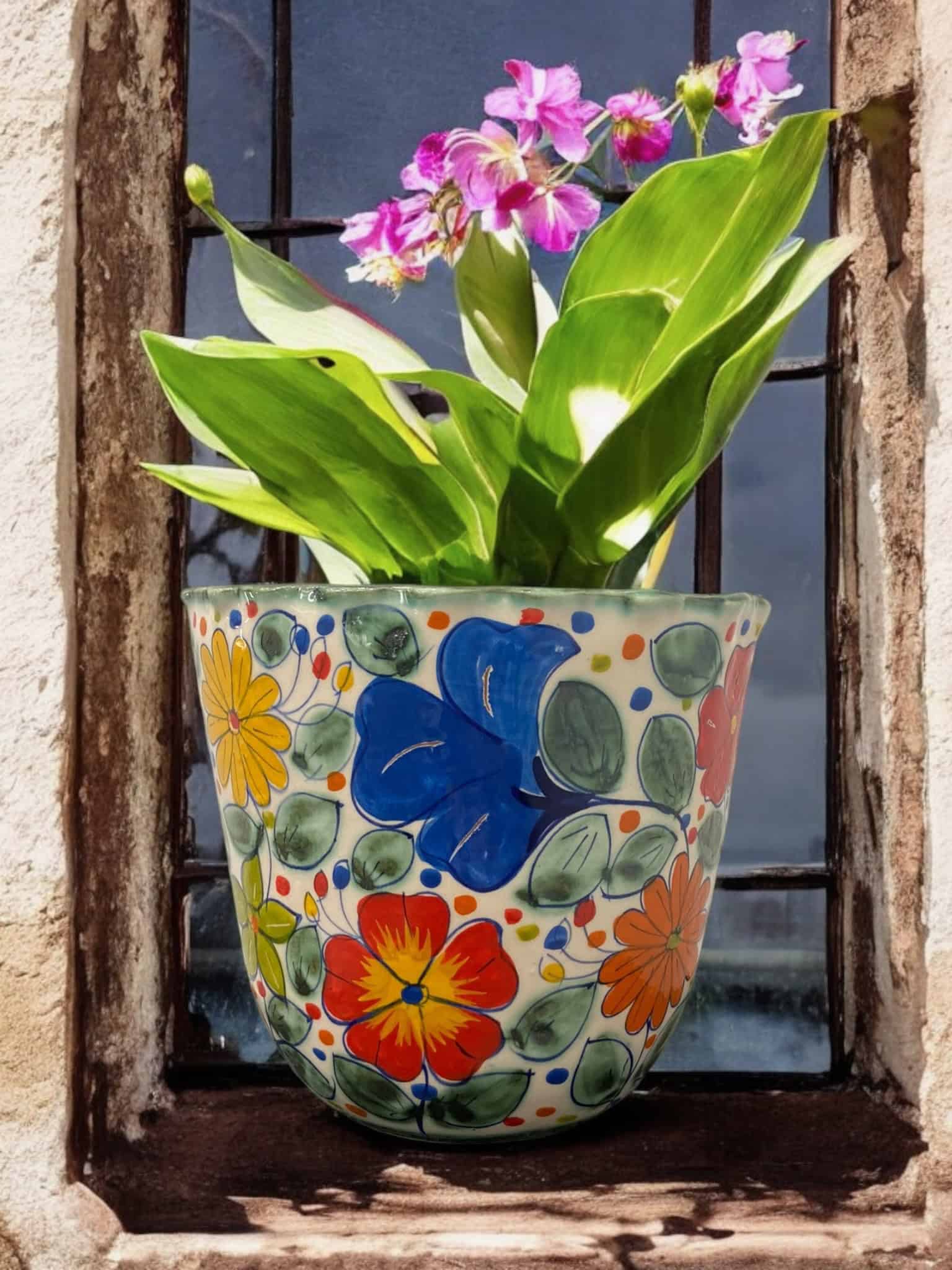 Maceta de cerámica hecha y pintada a mano por artesanos limeños. Ideal para orquídeas, plantas aromáticas, plantas de temporada, etc.