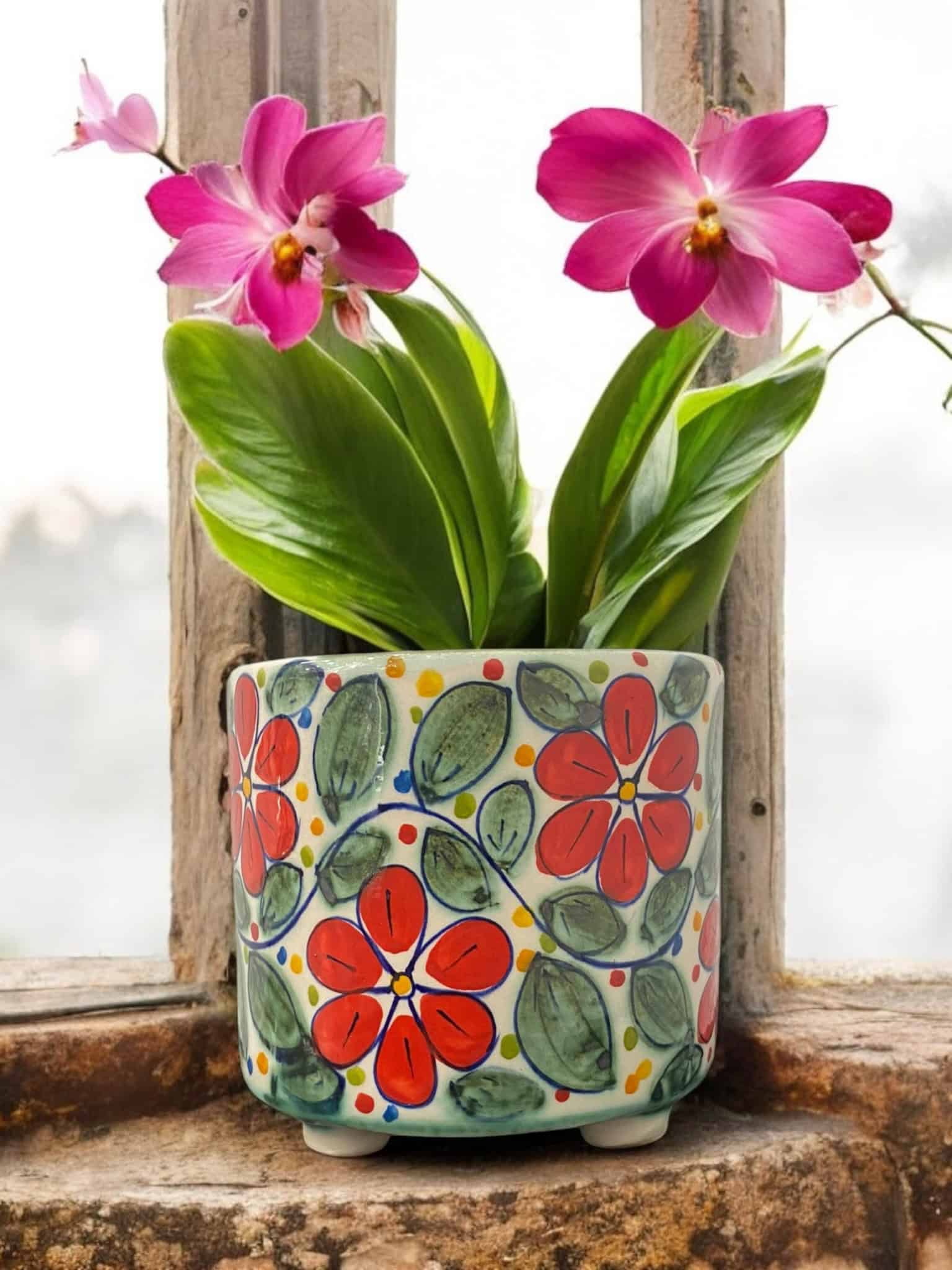 Maceta de cerámica hecha y pintada a mano por artesanos limeños. Ideales para orquídeas, plantas aromáticas, plantas de temporada, etc.