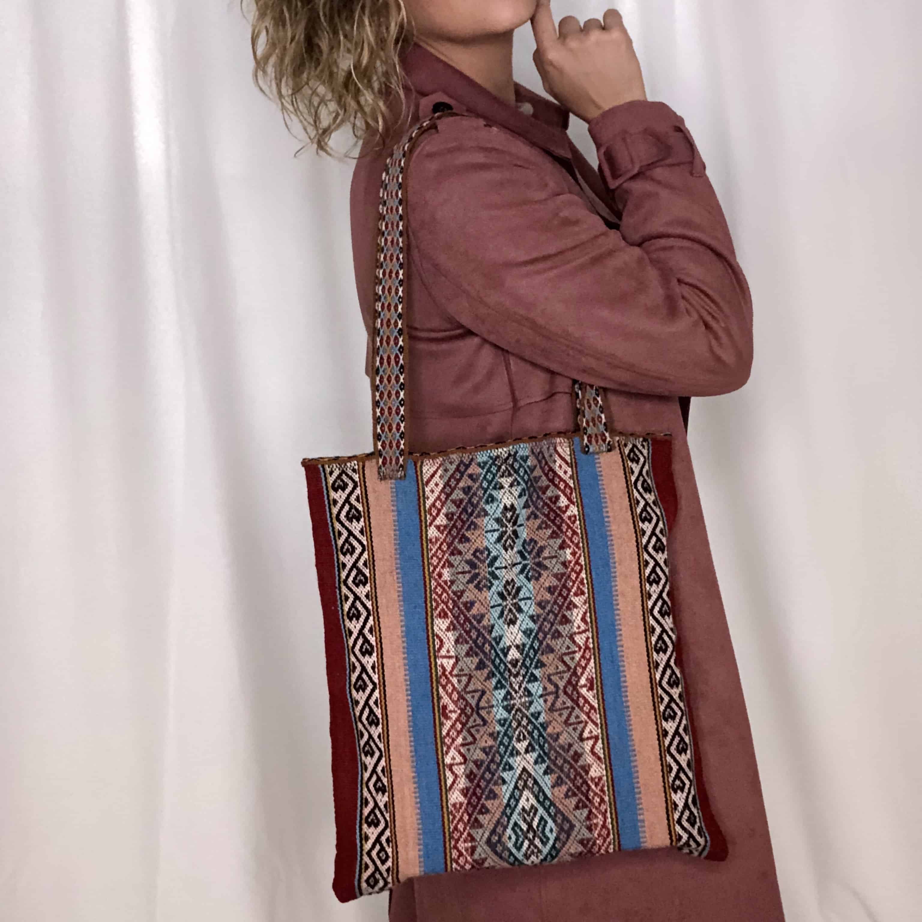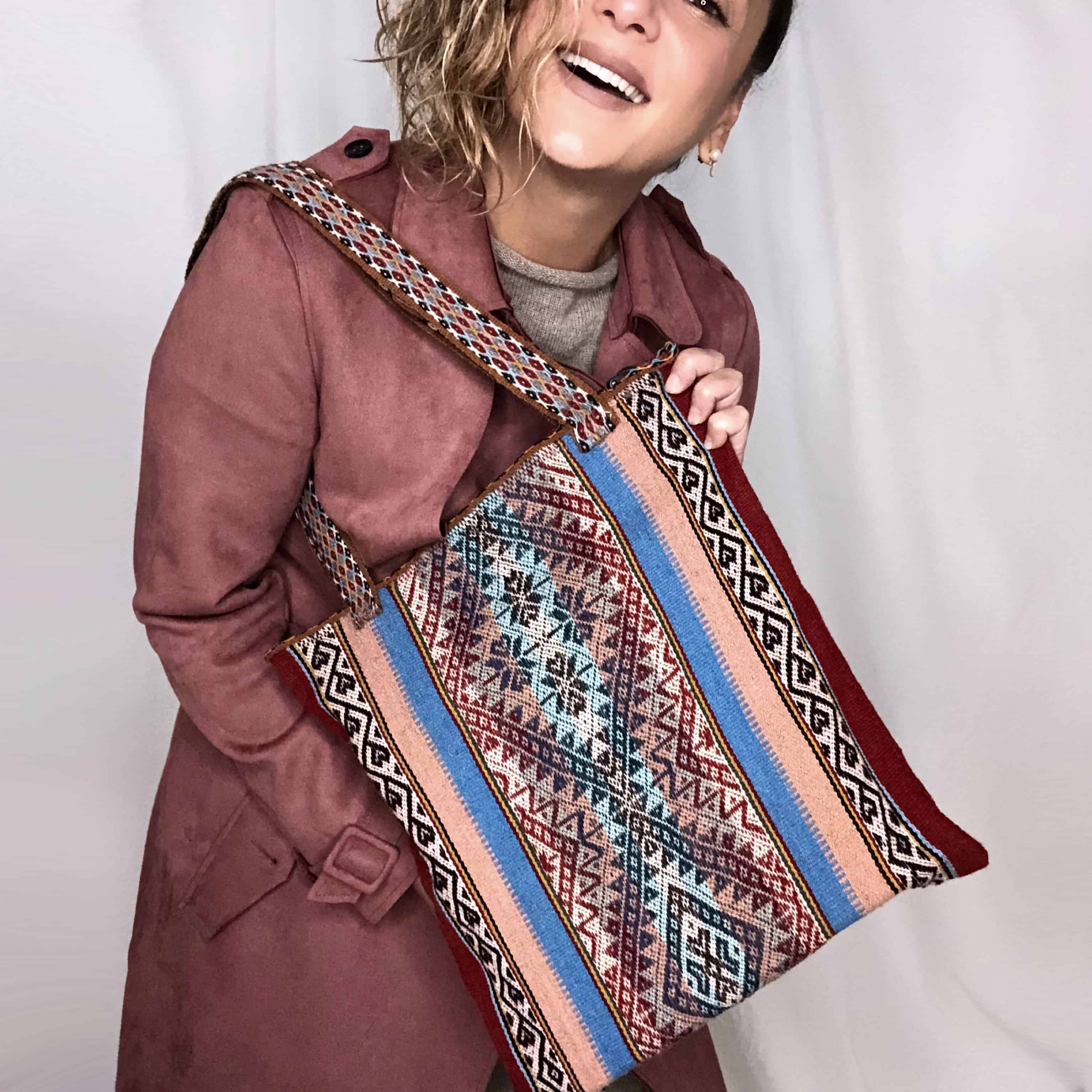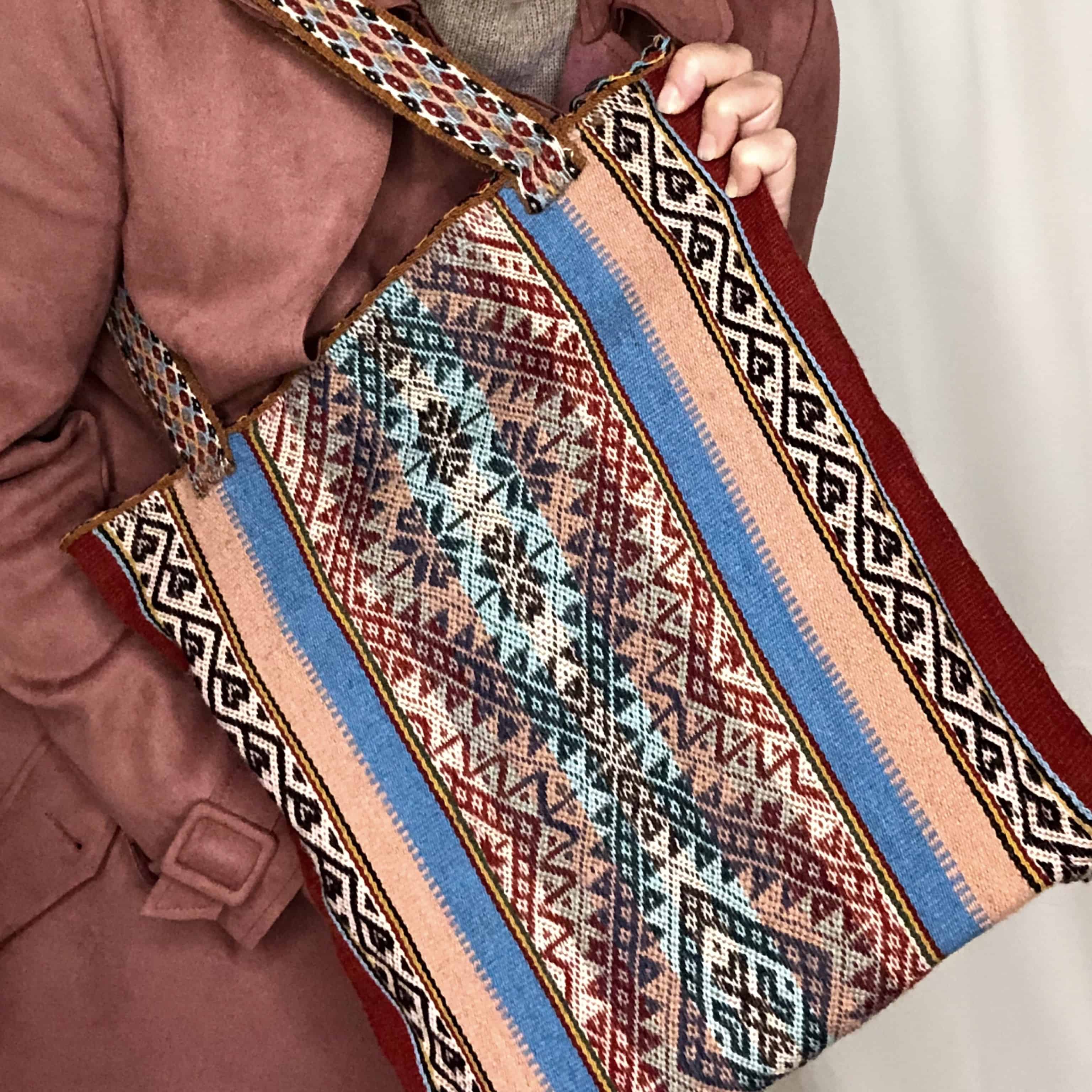 Tote bag tejida en telar de cintura por artesanas de comunidades altoandinas. Hecha de lana de alpaca 100% natural.