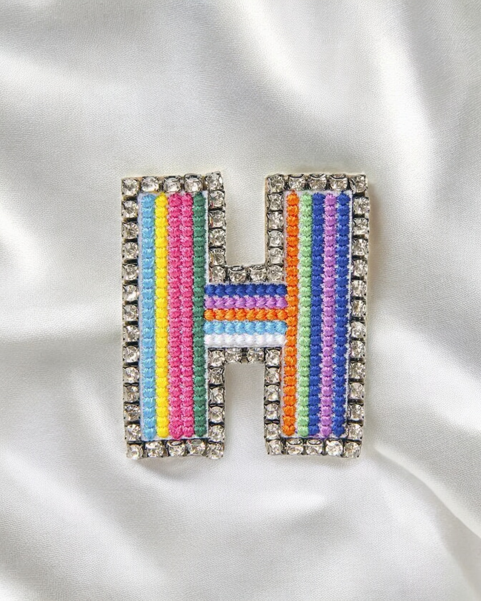 Broche de letras con apliques bordados. elaborado en fantasía fina y pedrería, es una excelente adición para hacer de tu look mas divertido y original.