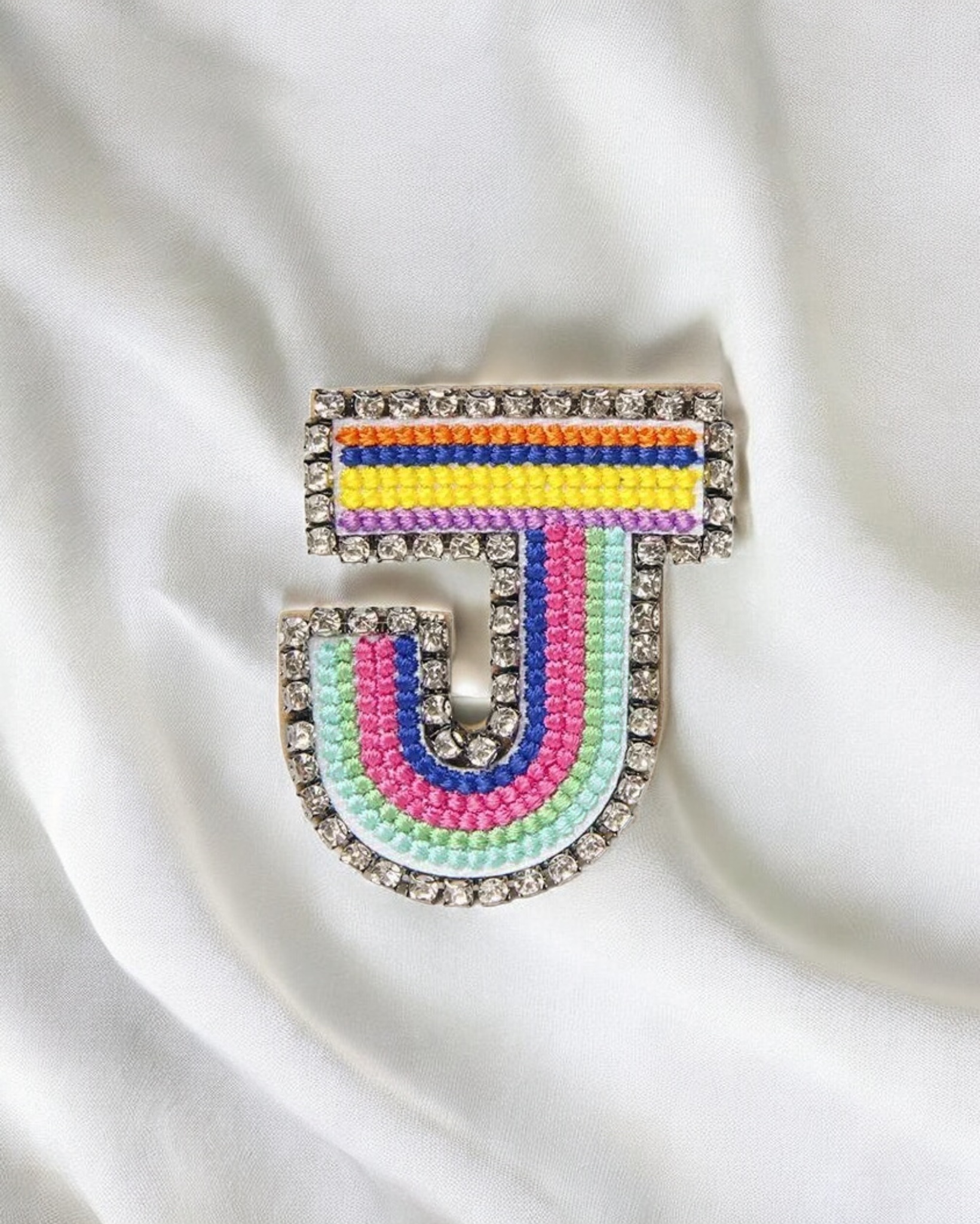Broche de letras con apliques bordados. elaborado en fantasía fina y pedrería, es una excelente adición para hacer de tu look mas divertido y original.