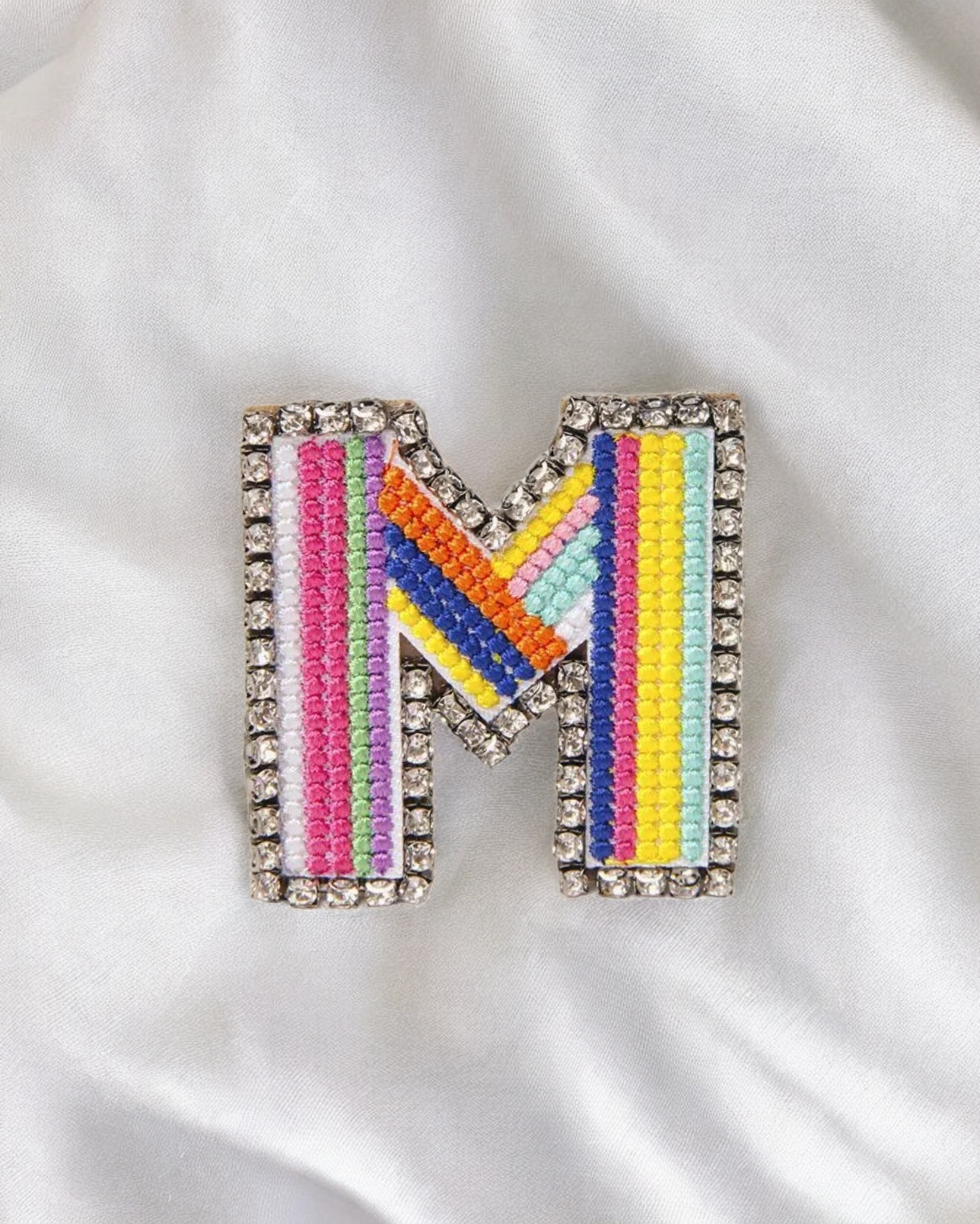 Broche de letras con apliques bordados. elaborado en fantasía fina y pedrería, es una excelente adición para hacer de tu look mas divertido y original.