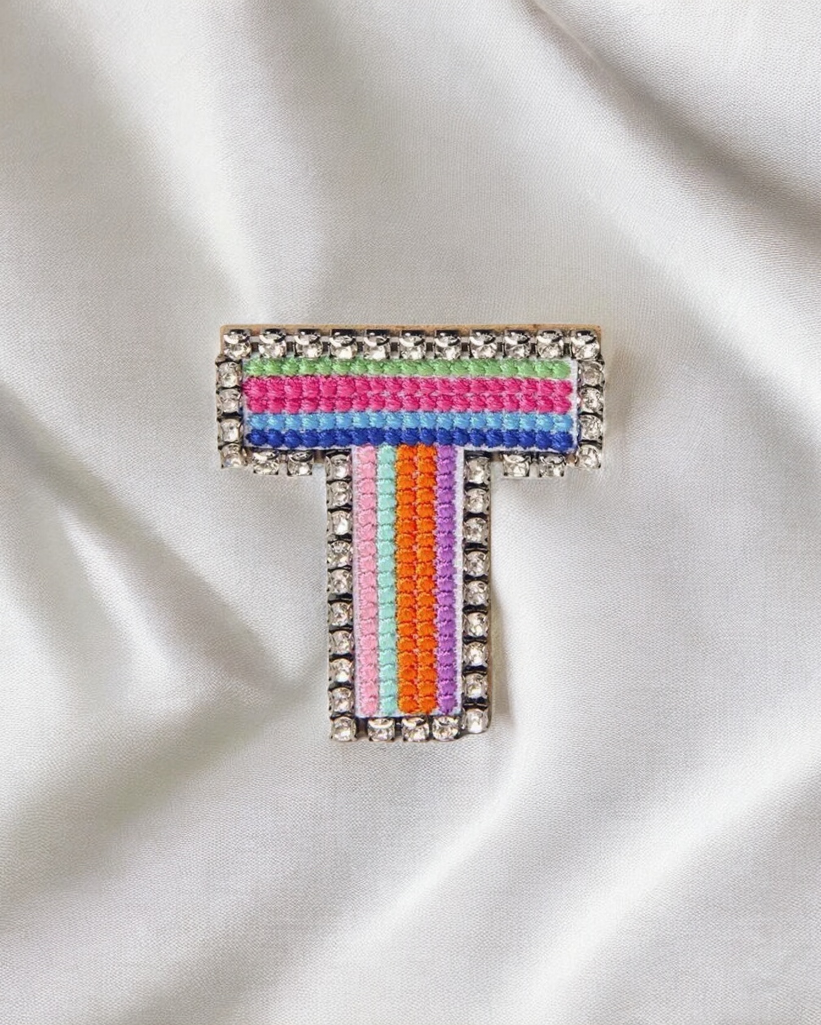 Broche de letras con apliques bordados. elaborado en fantasía fina y pedrería, es una excelente adición para hacer de tu look mas divertido y original.