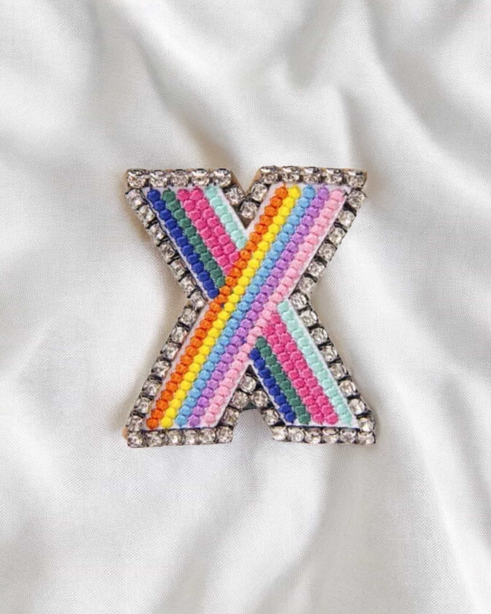 Broche de letras con apliques bordados. elaborado en fantasía fina y pedrería, es una excelente adición para hacer de tu look mas divertido y original.
