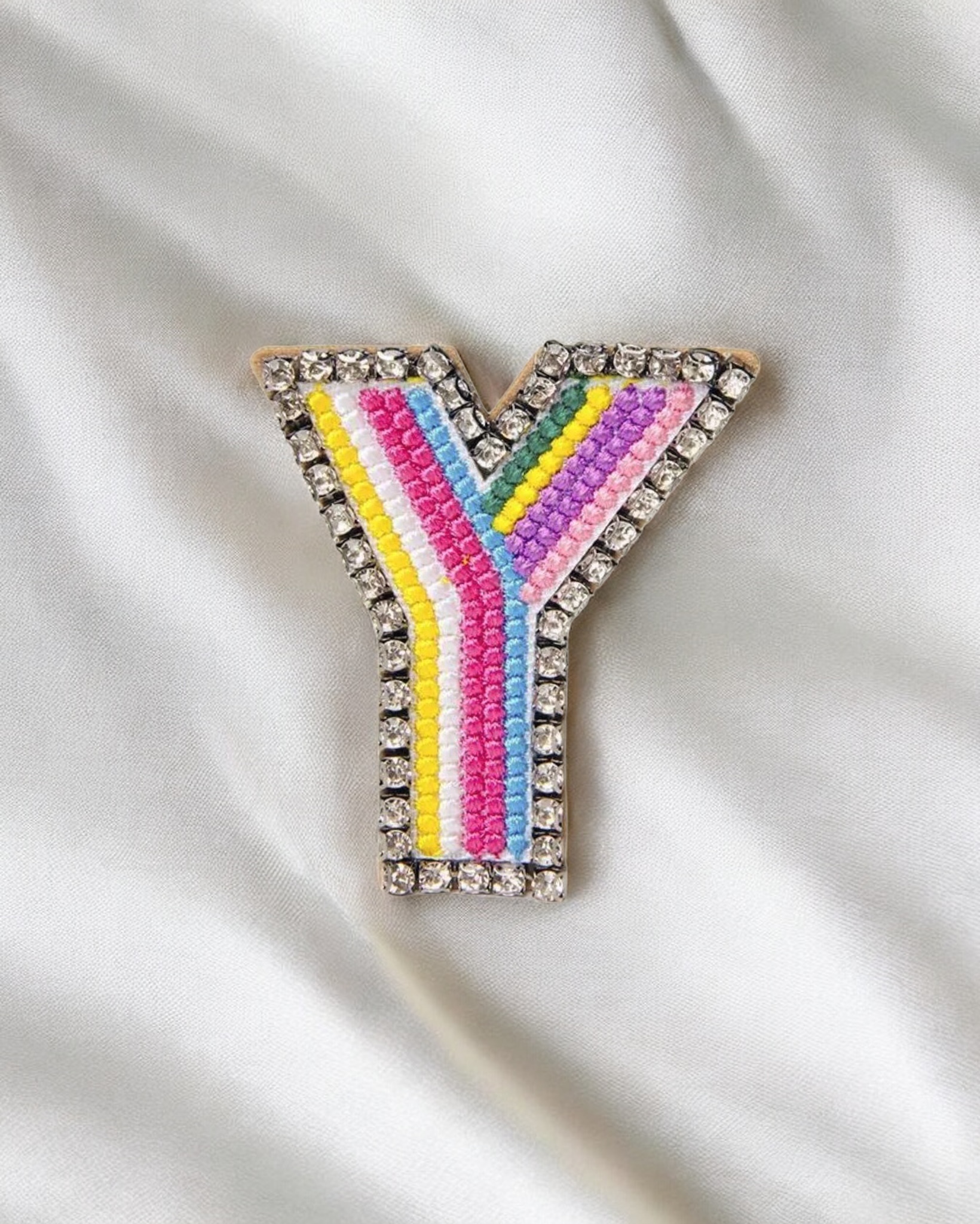 Broche de letras con apliques bordados. elaborado en fantasía fina y pedrería, es una excelente adición para hacer de tu look mas divertido y original.