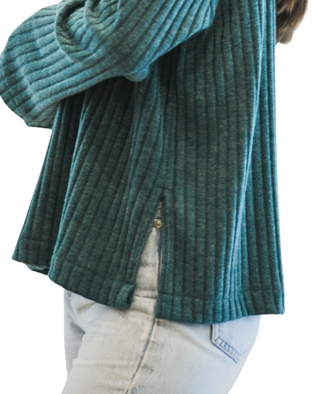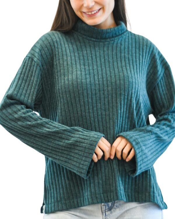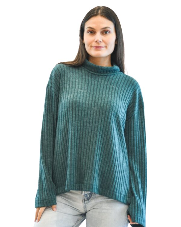 Polo de manga larga estilo chompero en tejido acanalado que se adapta suavemente al cuerpo. Incorpora un cuello alto que brinda abrigo y un toque sofisticado al look.