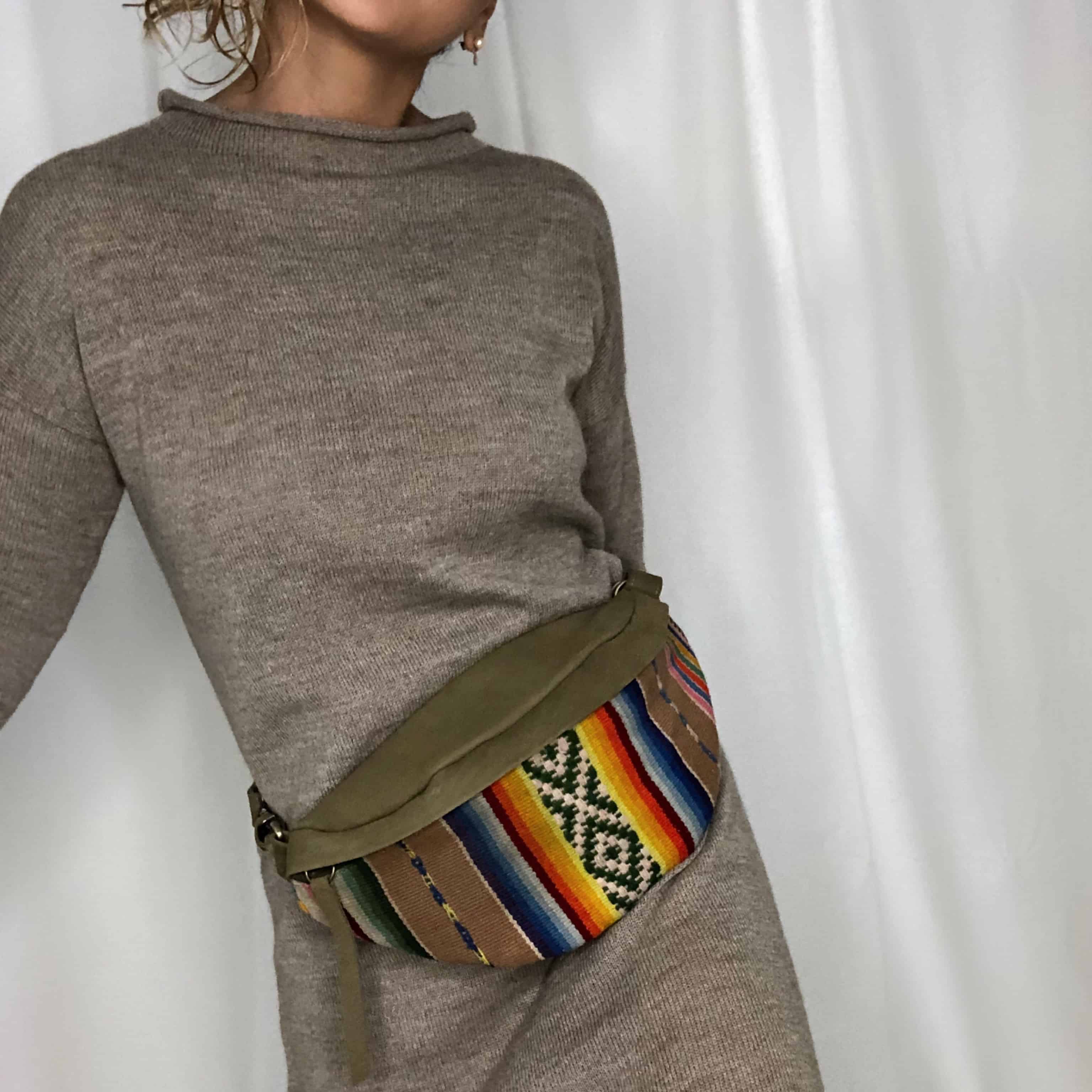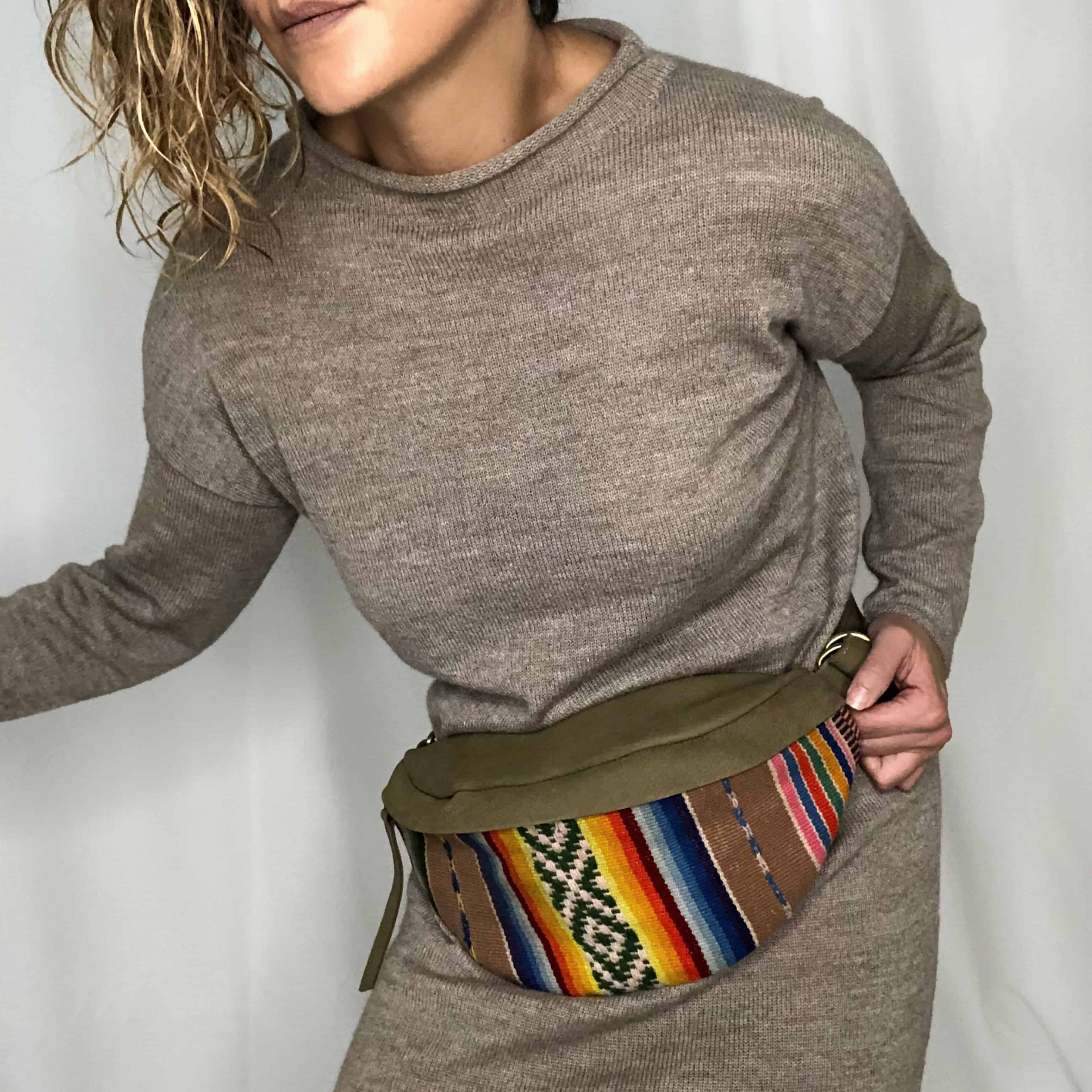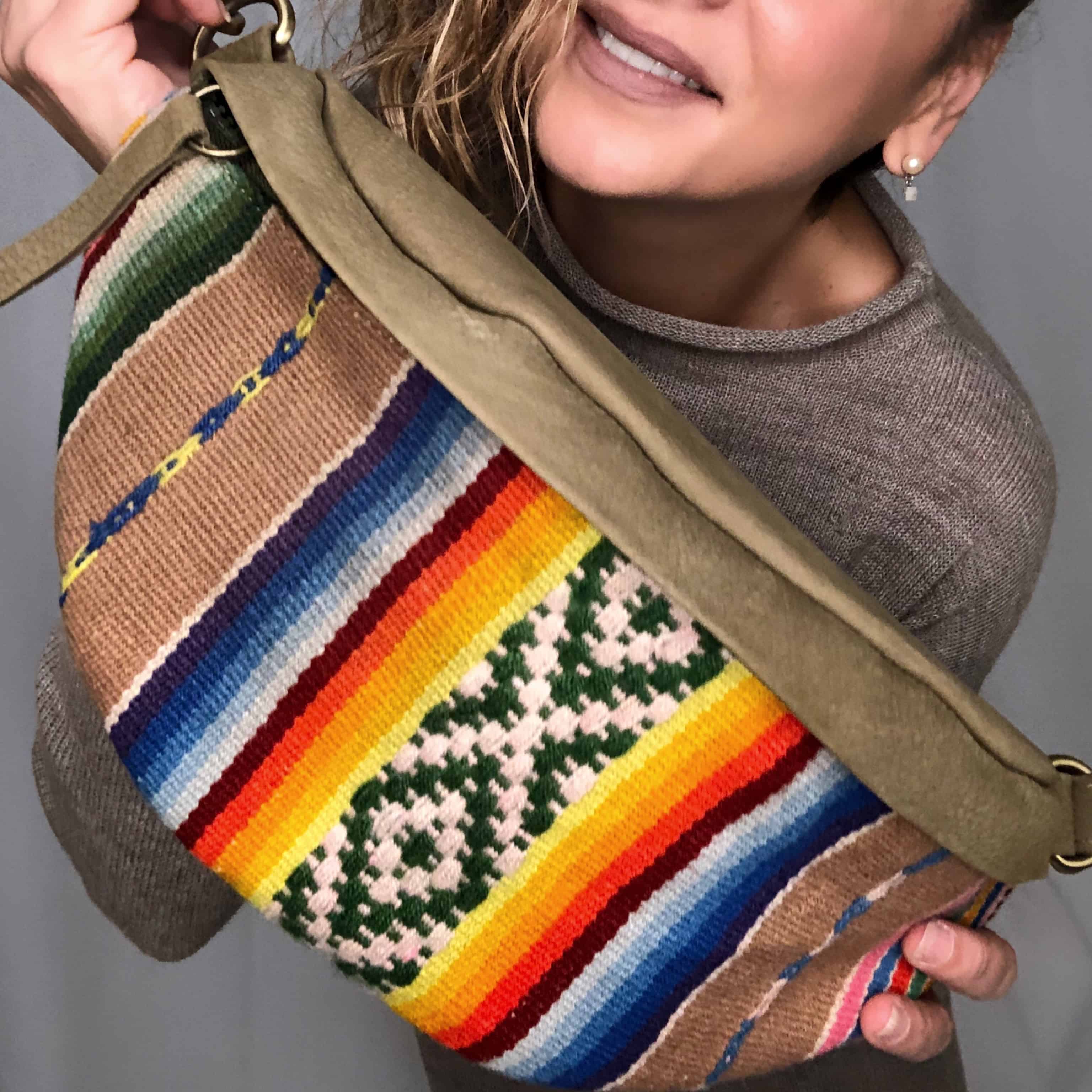 Canguro de cuero y telar hecho a mano por comunidades altoandinas. Pieza única de diseño que celebra la tradición textil de los andes peruanos.