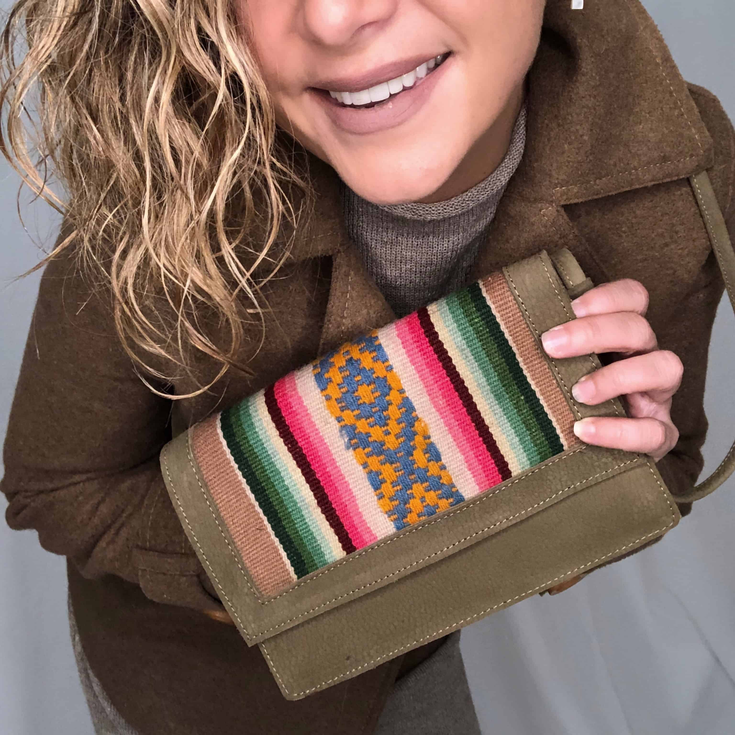 Carterita cruzada de cuero y telar hecho a mano por comunidades altoandinas.