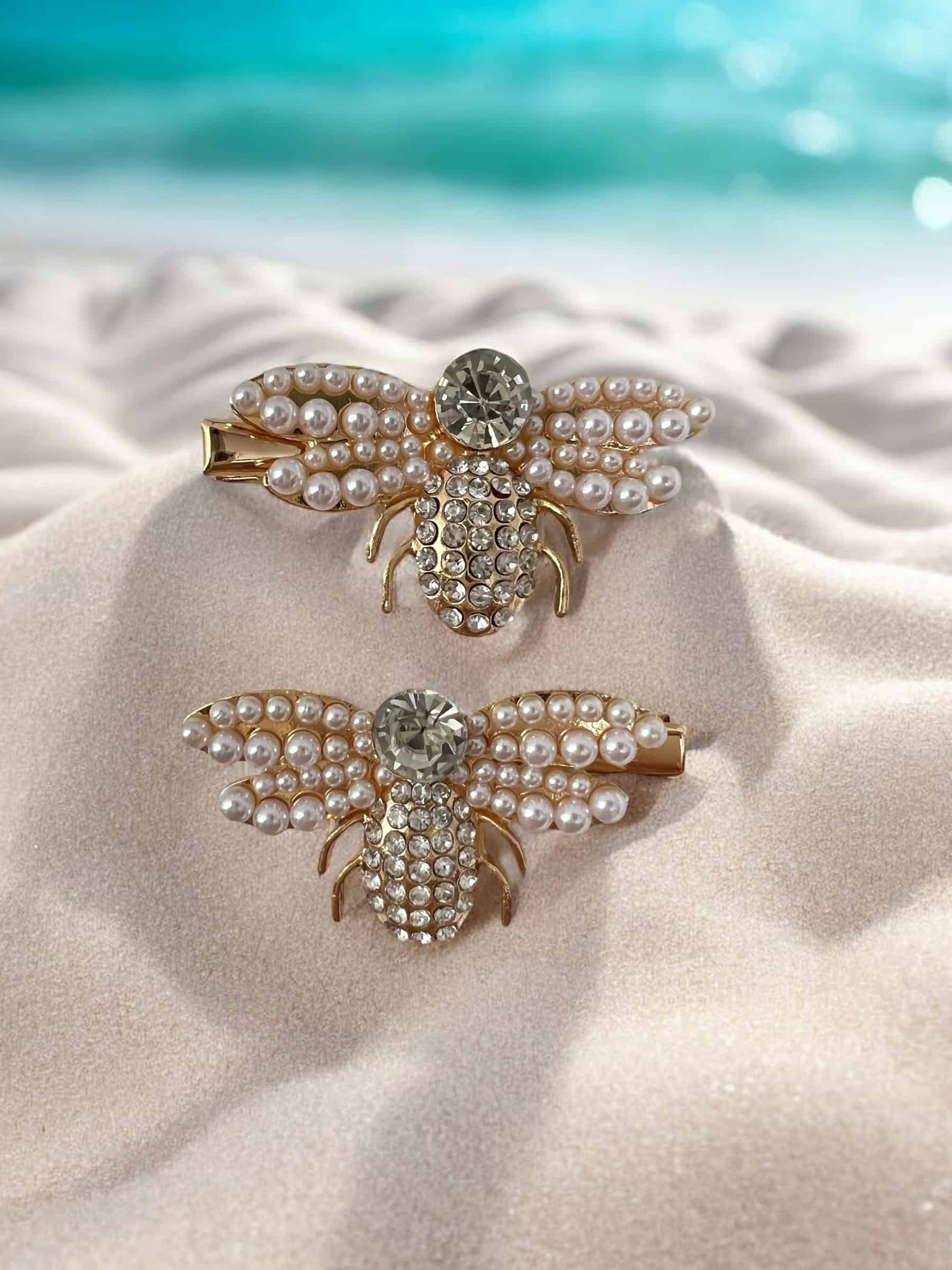 Ganchos de acero inoxidable con pedrería y perlas de fantasía, diseño de abejas, súper elegante, ligero y divertido.