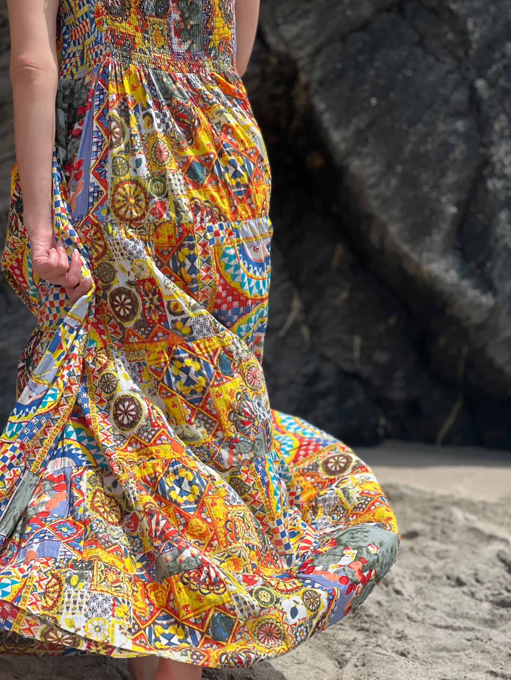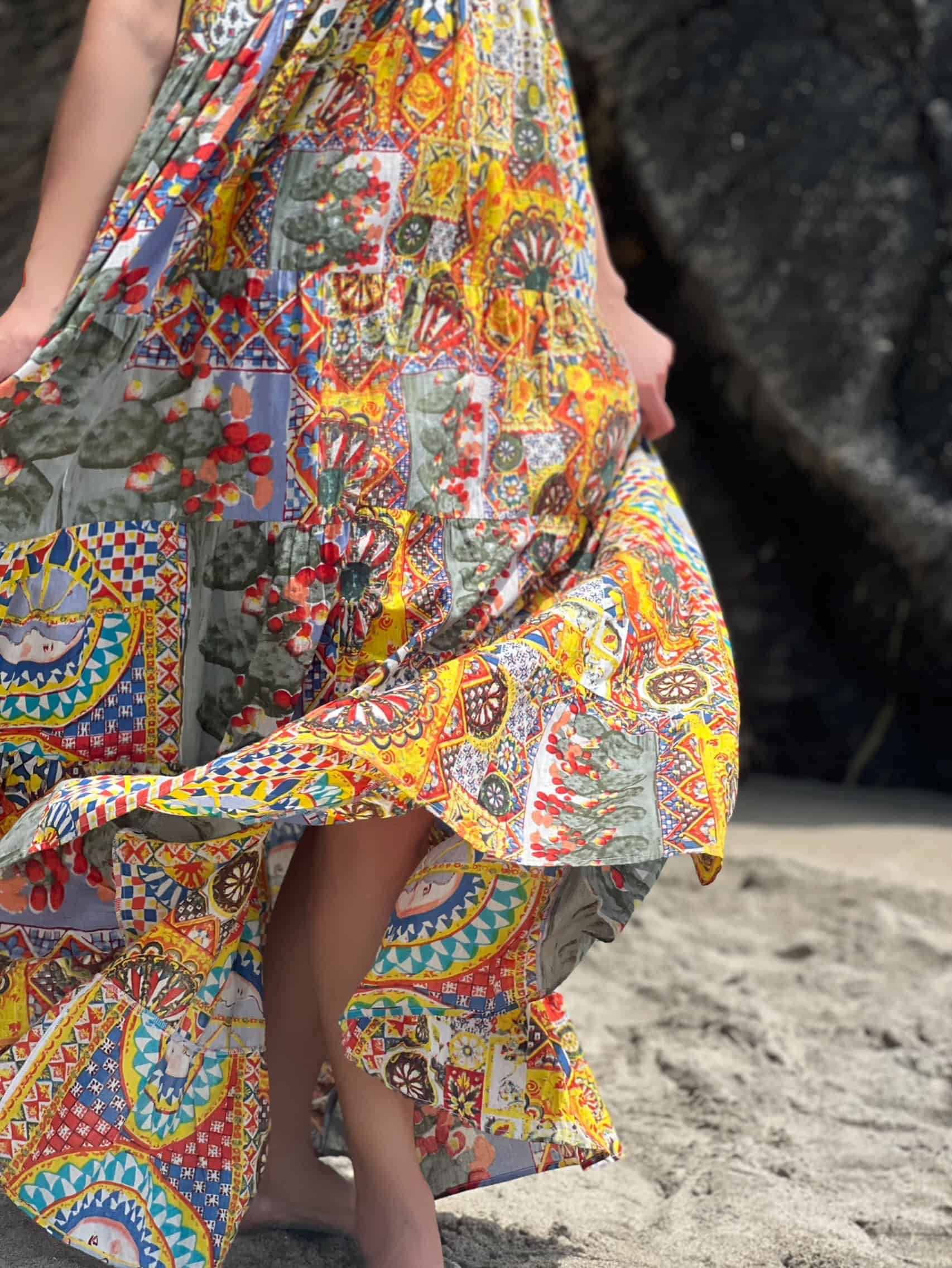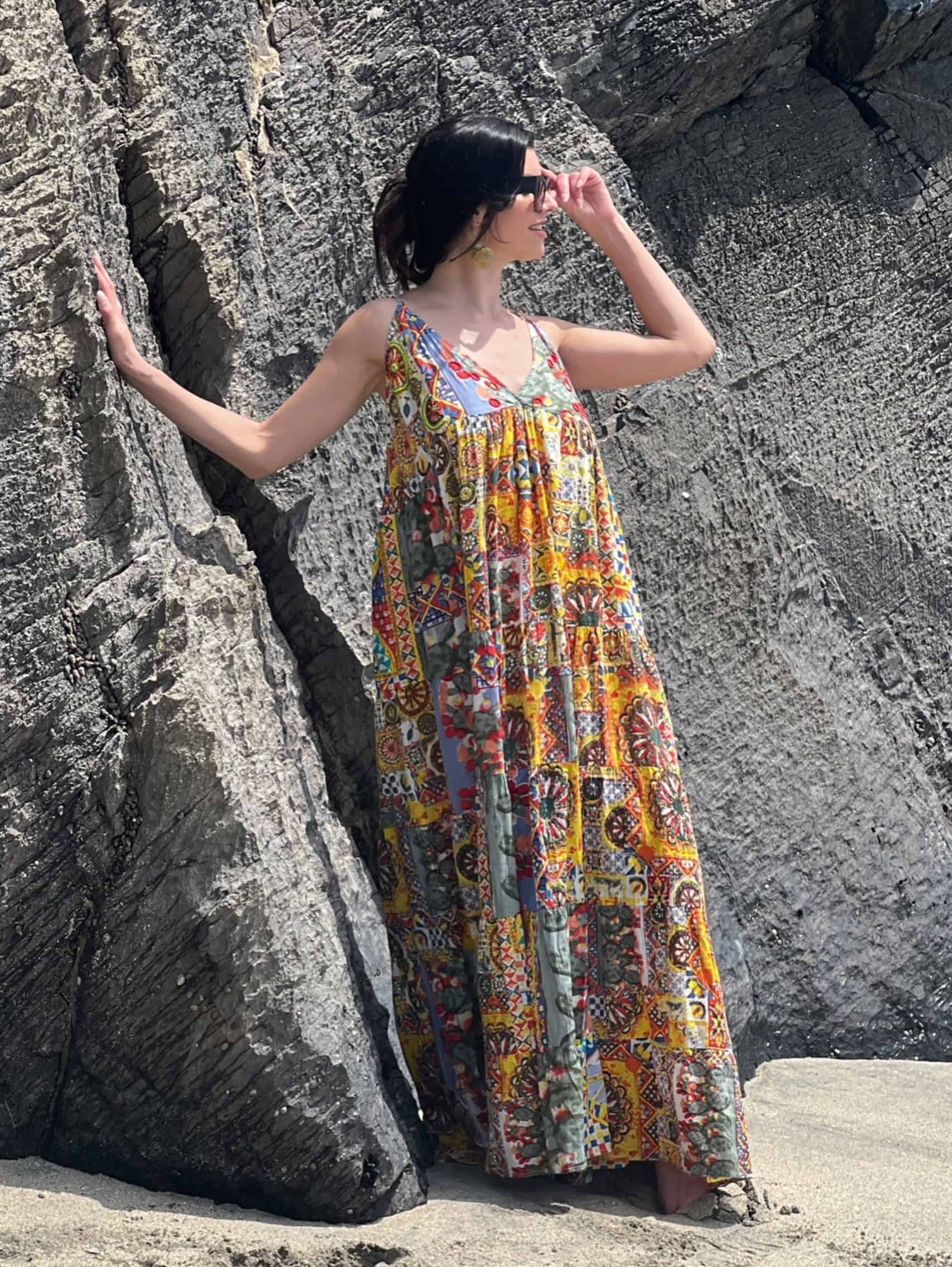 Diseño, confección y tela italiana. Vestido con escote halter ajustable que realza y define la silueta. Su parte inferior presenta una caída fluida que aporta movimiento y frescura, creando un equilibrio entre elegancia y comodidad, ideal para looks veraniegos o de ocasión.