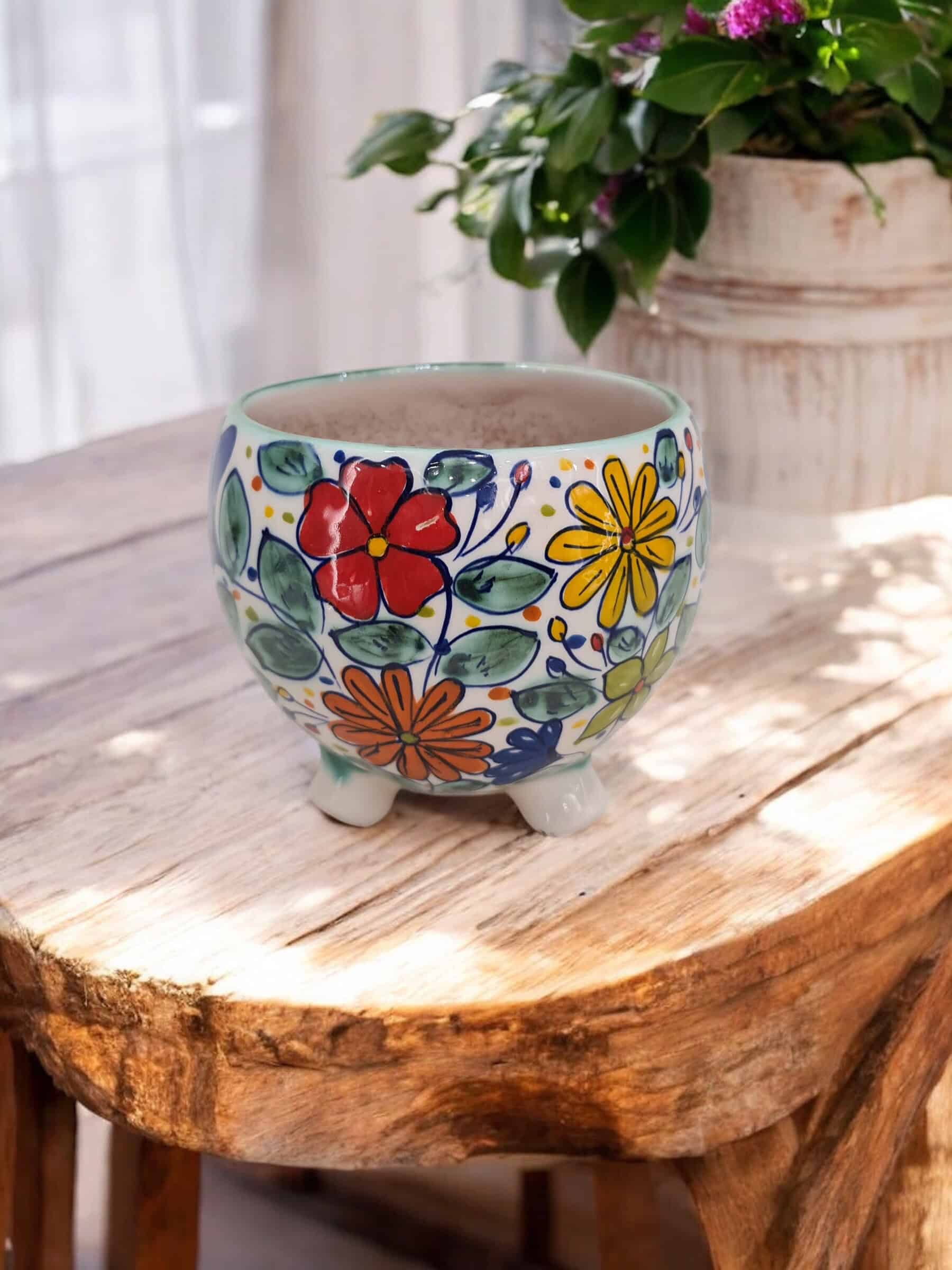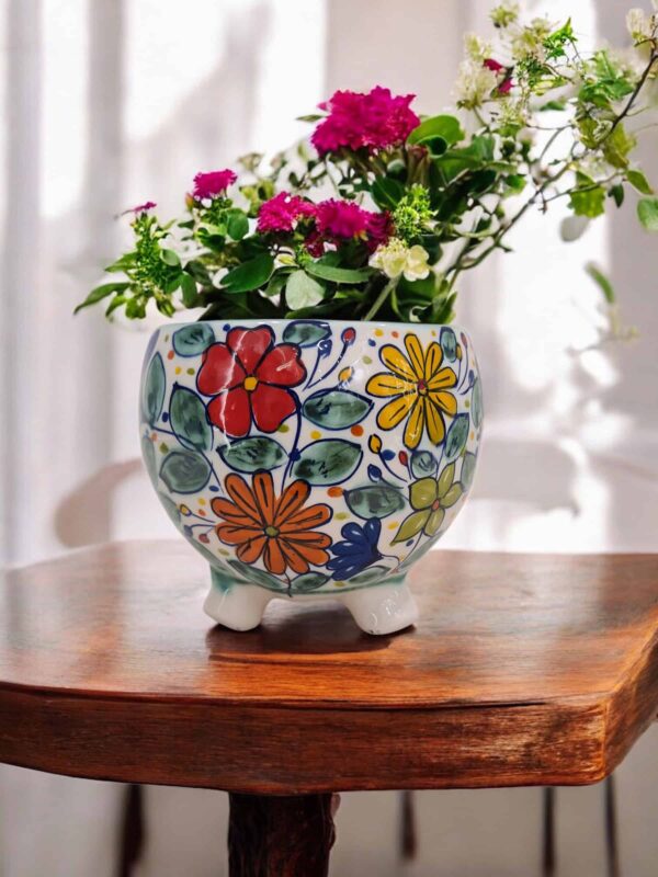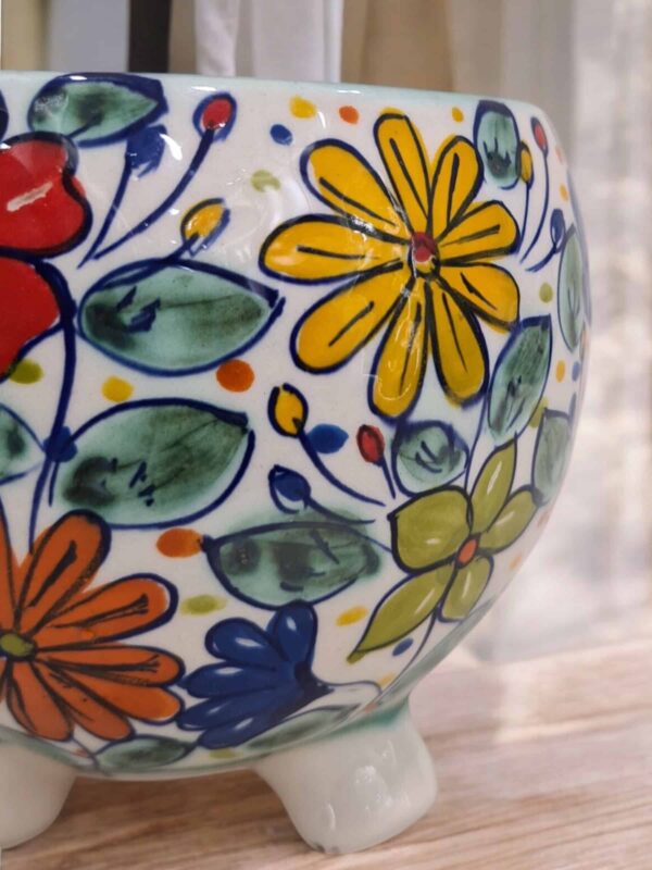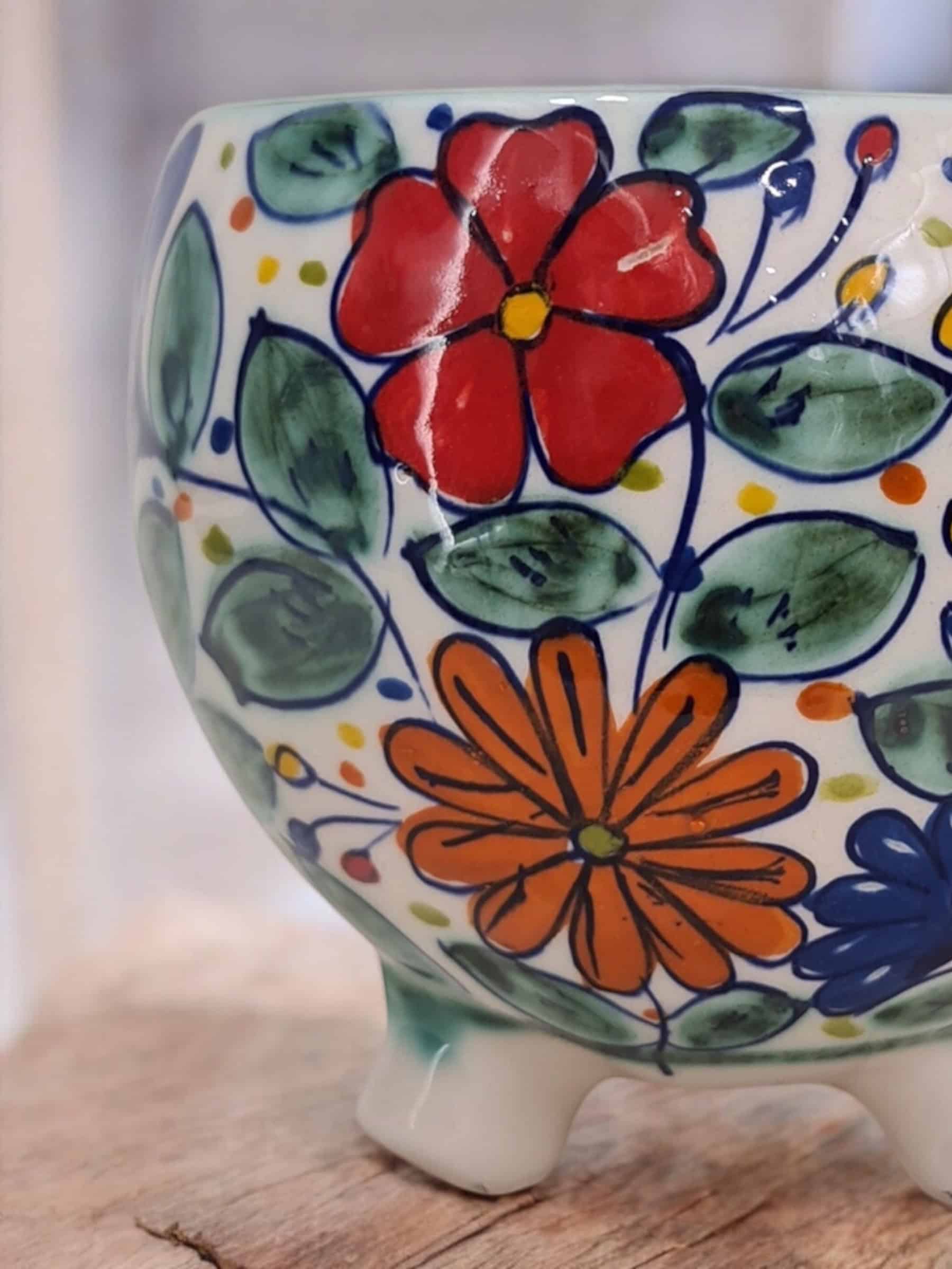 Maceta en forma de huevo con patitas de cerámica. Elaborada a mano y pintada por artesanos limeños. Ideal para suculentas, plantas aromáticas entre otras.