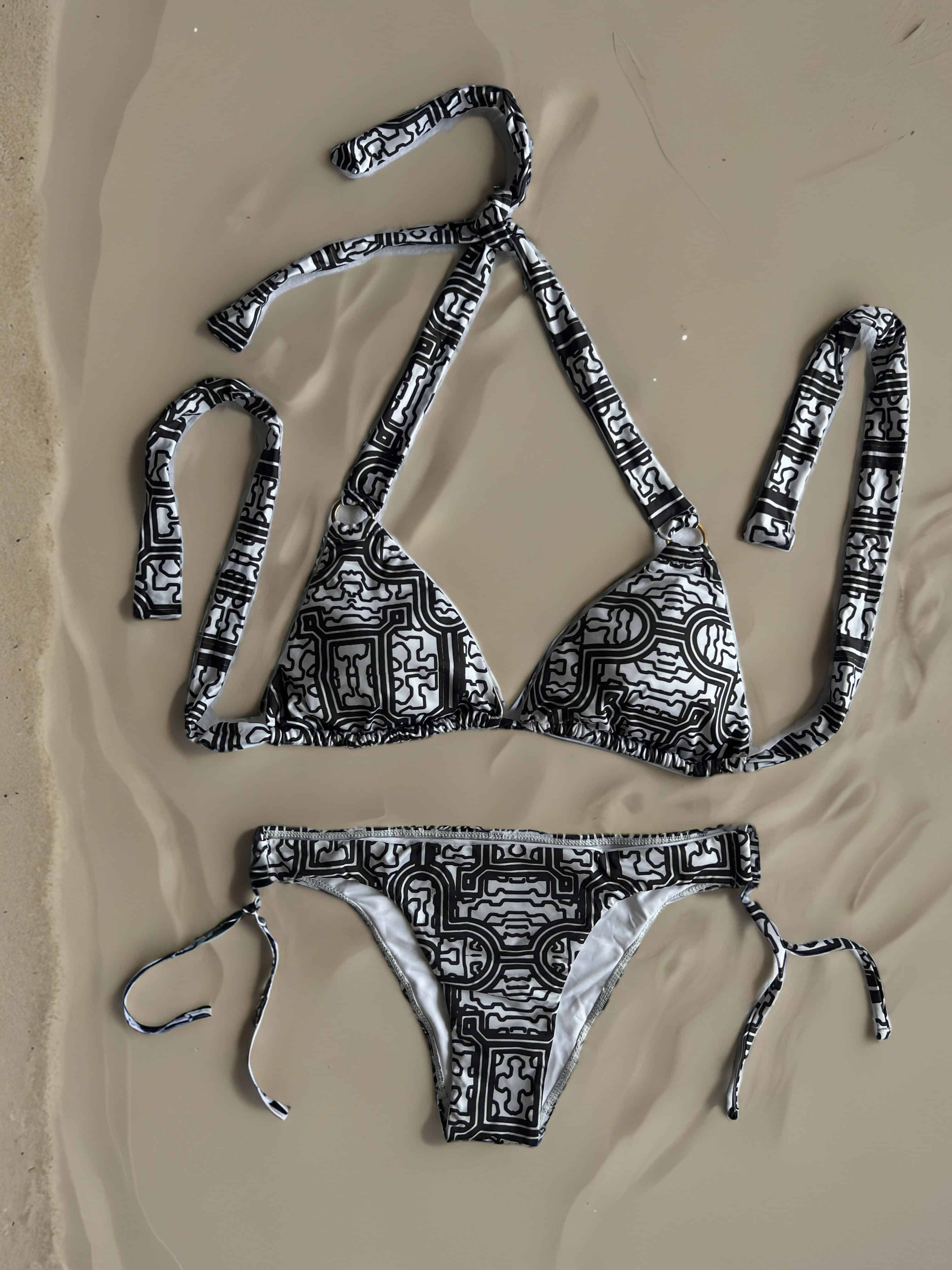 Bikini de dos piezas con motivos de la selva peruana. La parte superior cuenta con copas triangulares ajustables, mientras que la parte inferior tiene tiras laterales para un ajuste perfecto. Ideal para lucir un estilo fresco y colorido en la playa o piscina.