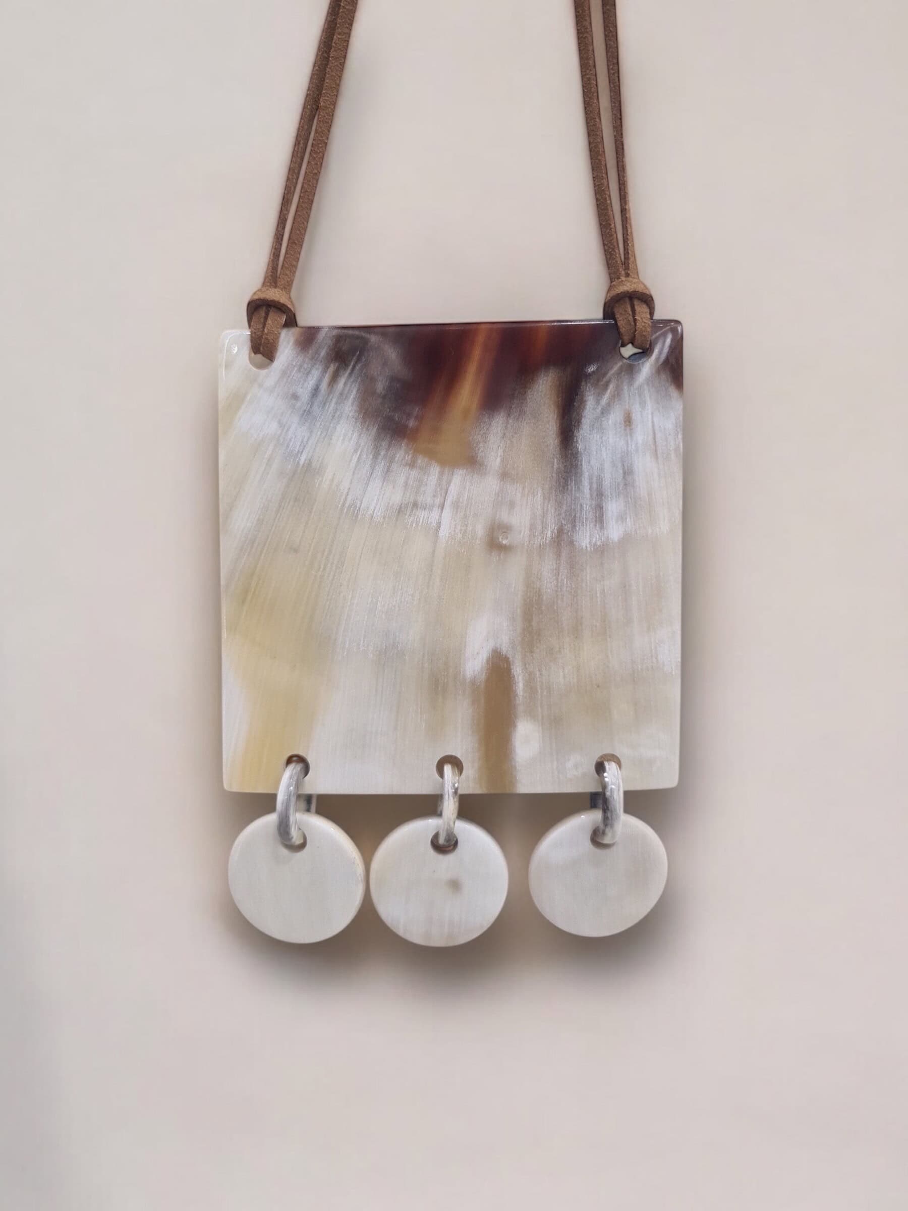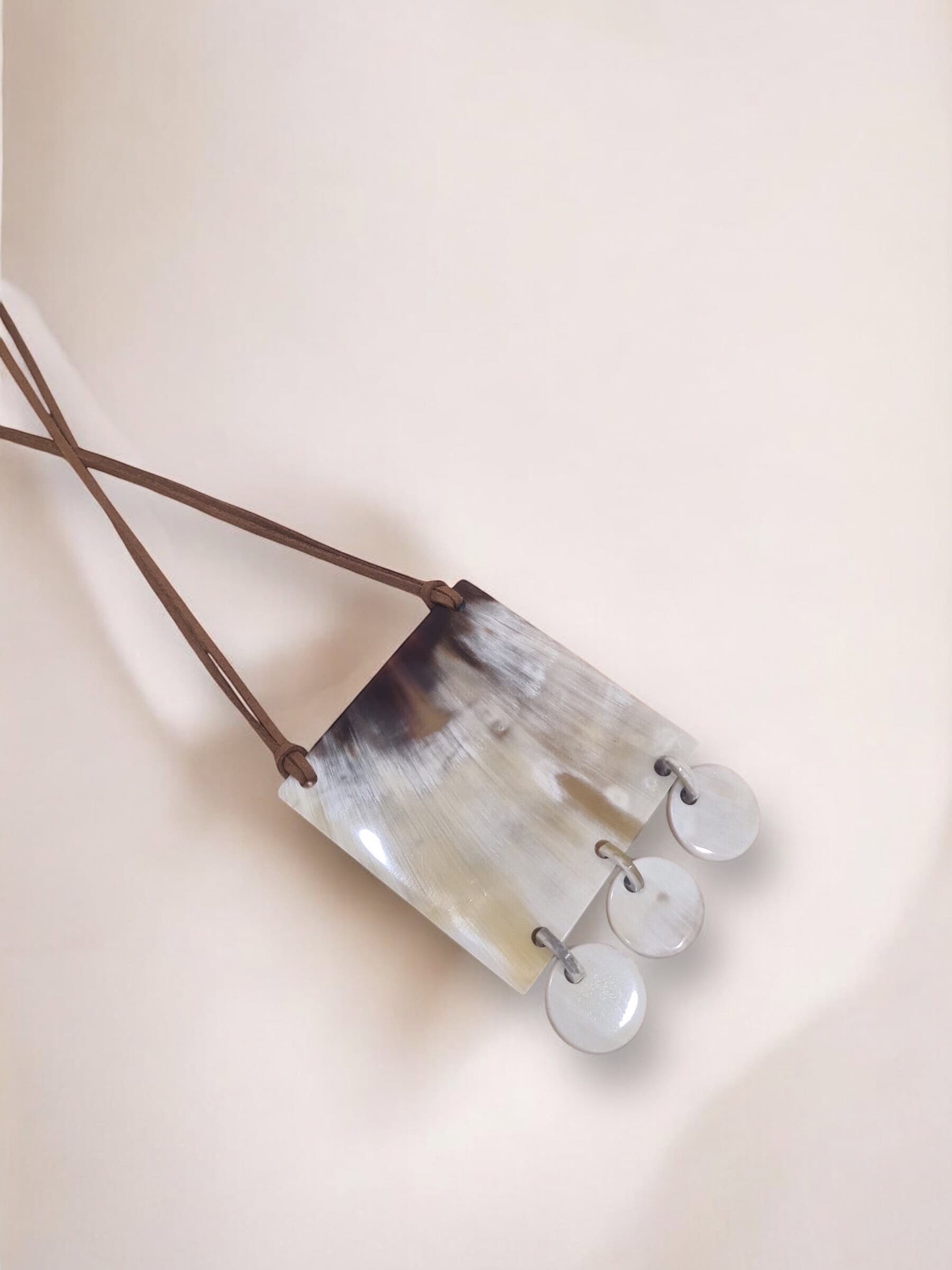 Collar largo hecho a mano en cacho de toro reciclado. La belleza del material y el trabajo fino artesanal dan como resultado una pieza única y sostenible.