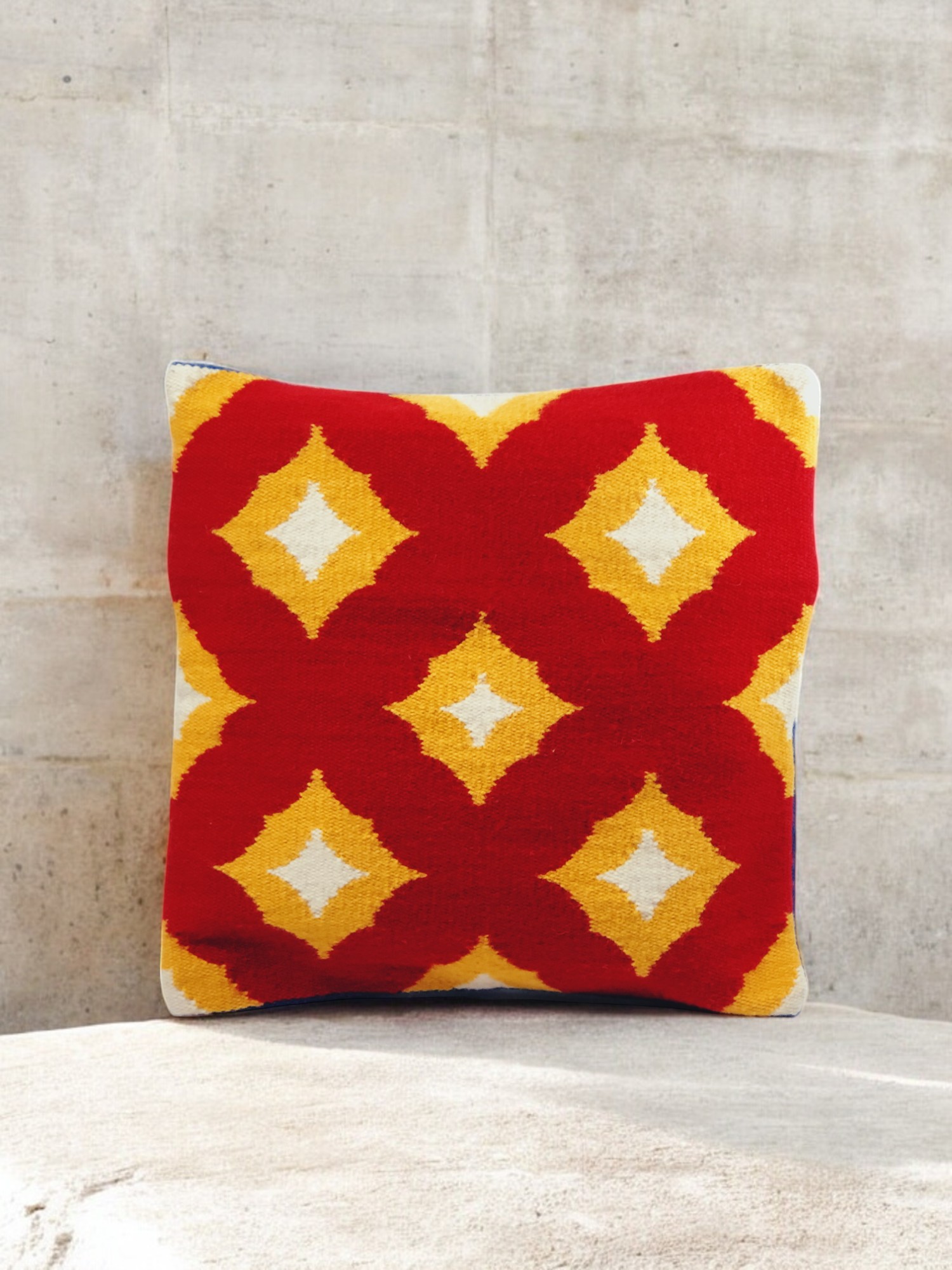 Forro de Cojín cuadrado 50×50 cm. Hecho con hilado de algodón y oveja, a través de la técnica ancestral del telar, por artesanos de Ayacucho – Perú. No incluye relleno.