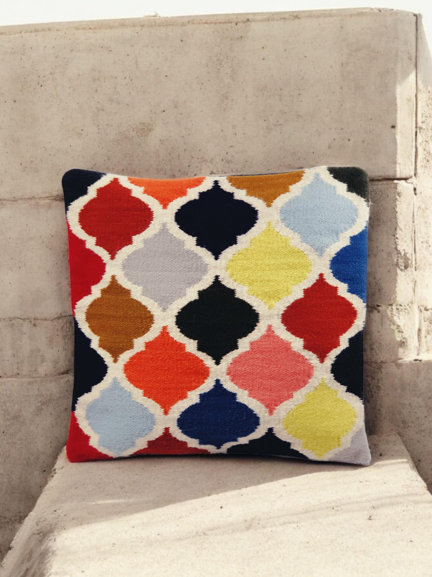 Forro de Cojín cuadrado 50×50 cm. Hecho con hilado de algodón y oveja, a través de la técnica ancestral del telar, por artesanos de Ayacucho – Perú. No incluye relleno.