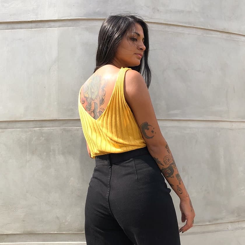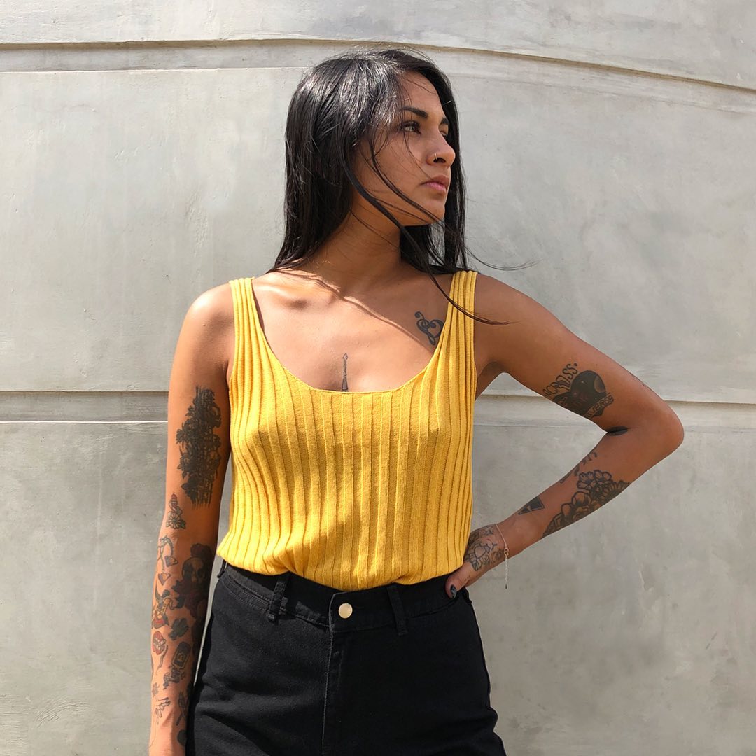 Top tejido en 100% algodón Tangüis. Es de punto acanalado, delicado y ligero. Es de escote delantero redondo y escote en V en la espalda. Un básico tejido con aire contemporáneo, infaltable en tu clóset.