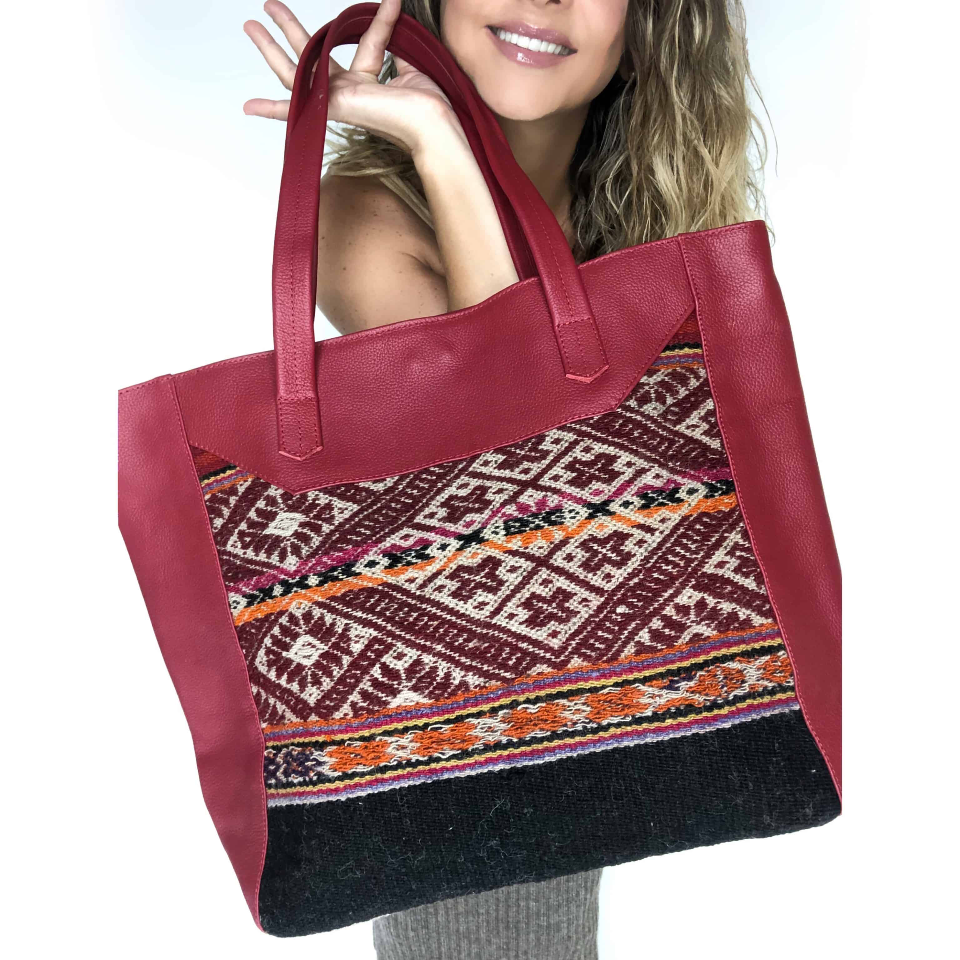 Bolso tote rojo de cuero y telar hecho a mano por comunidades altoandinas