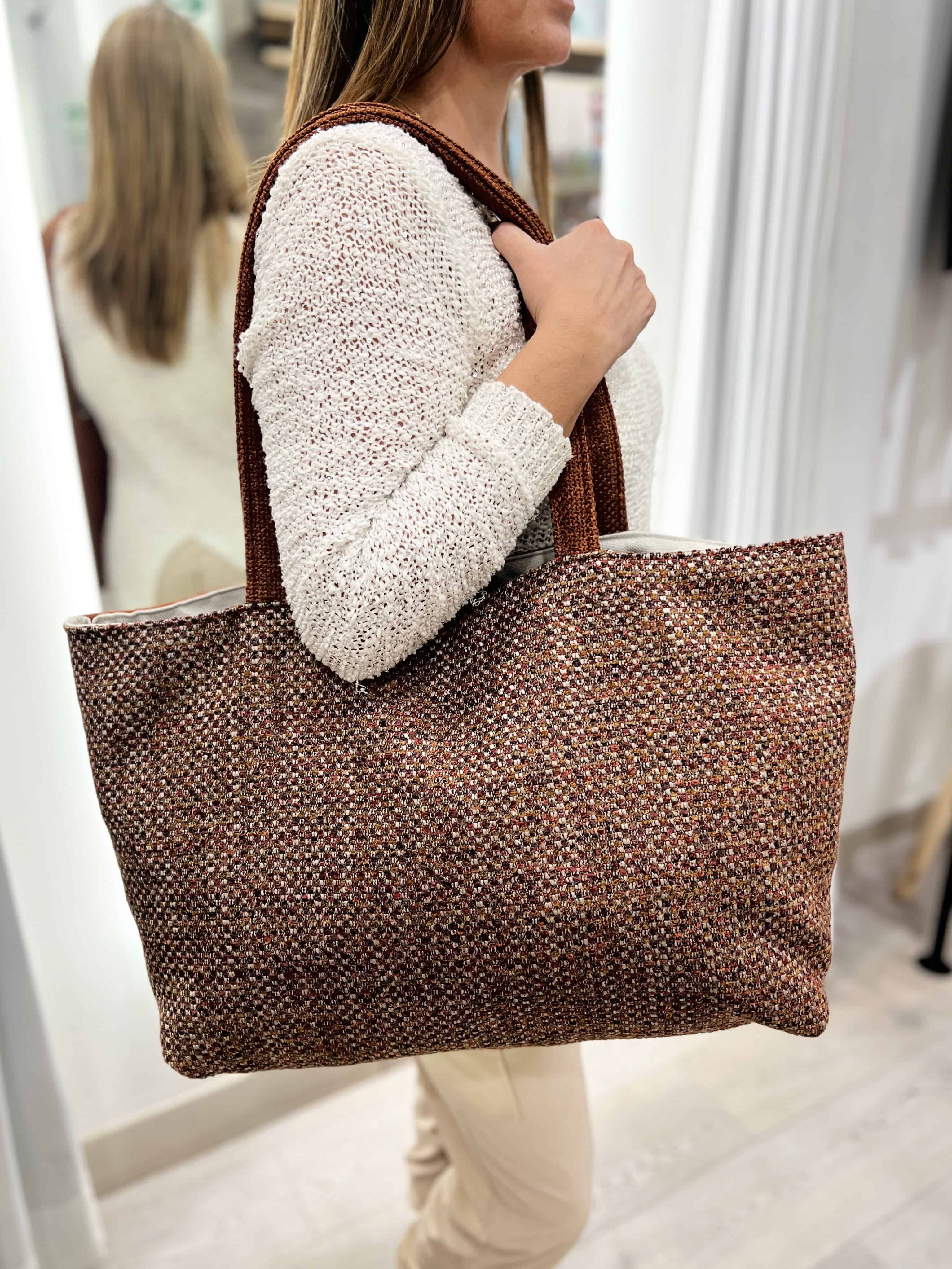 Maxibolso de tejido grueso de aspecto artesanal, con trama compacta que brinda resistencia y estructura. Ideal para quienes buscan estilo, durabilidad y un diseño auténtico.