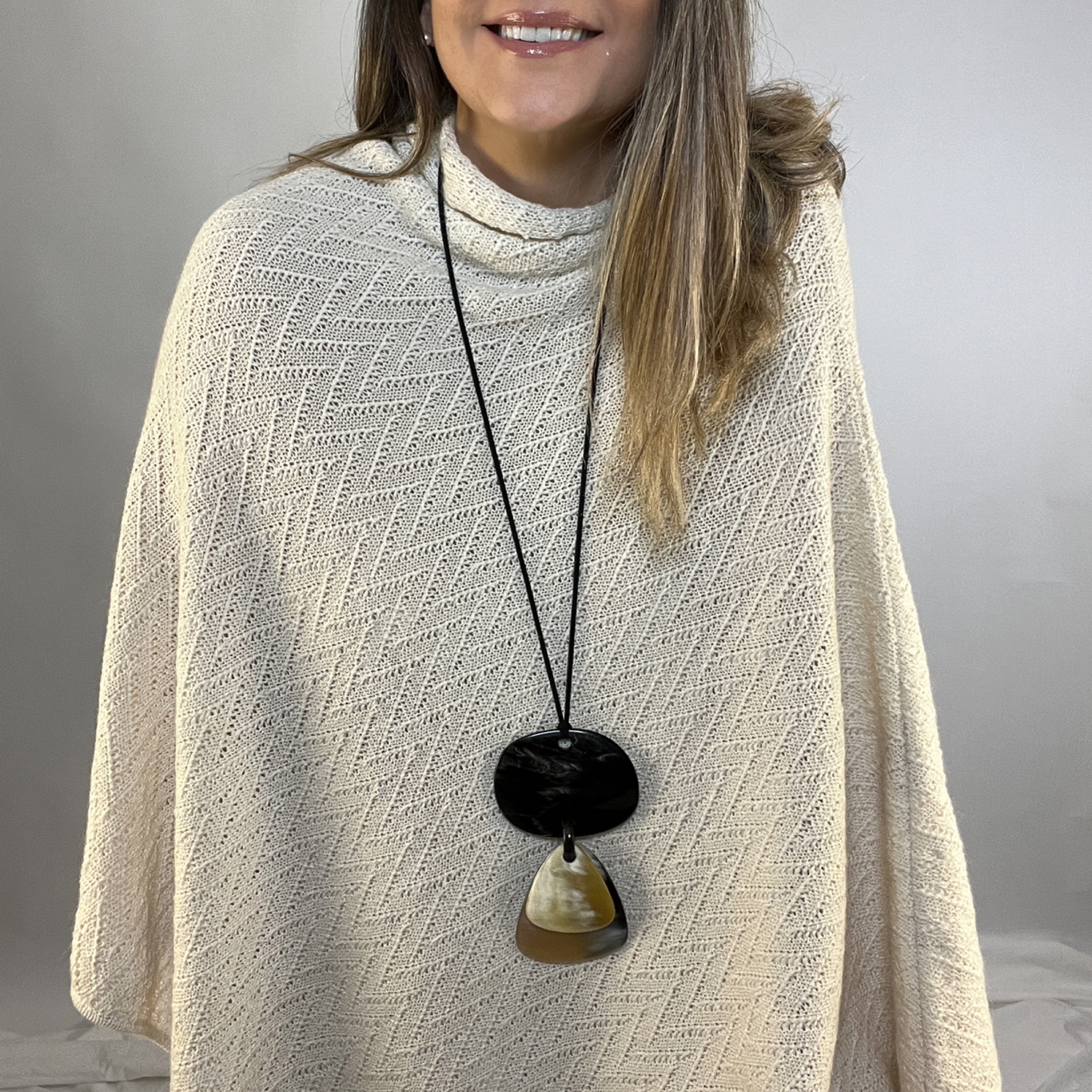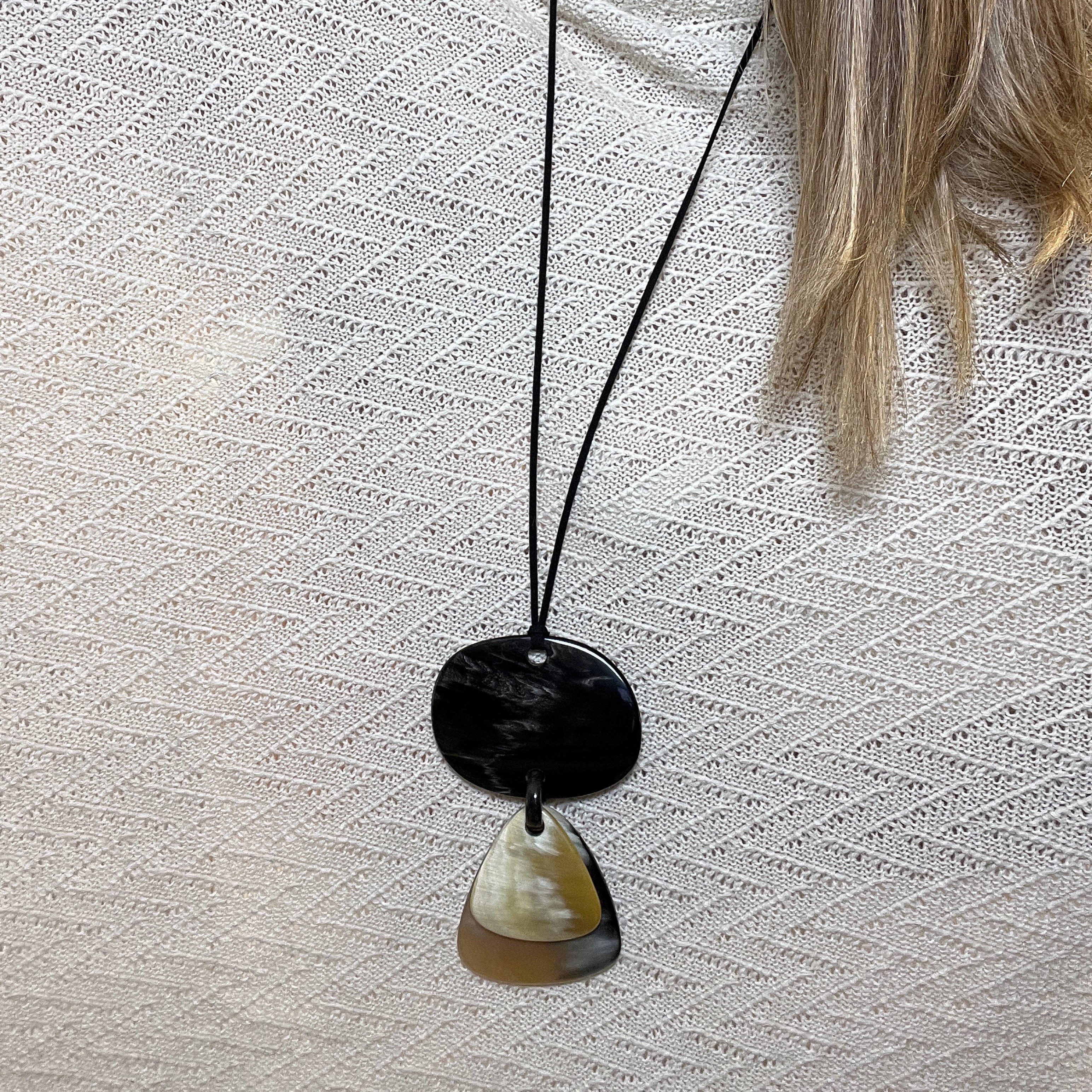 Collar largo hecho a mano en cacho de toro reciclado. La belleza del material y el trabajo fino artesanal dan como resultado una pieza única y sostenible.
