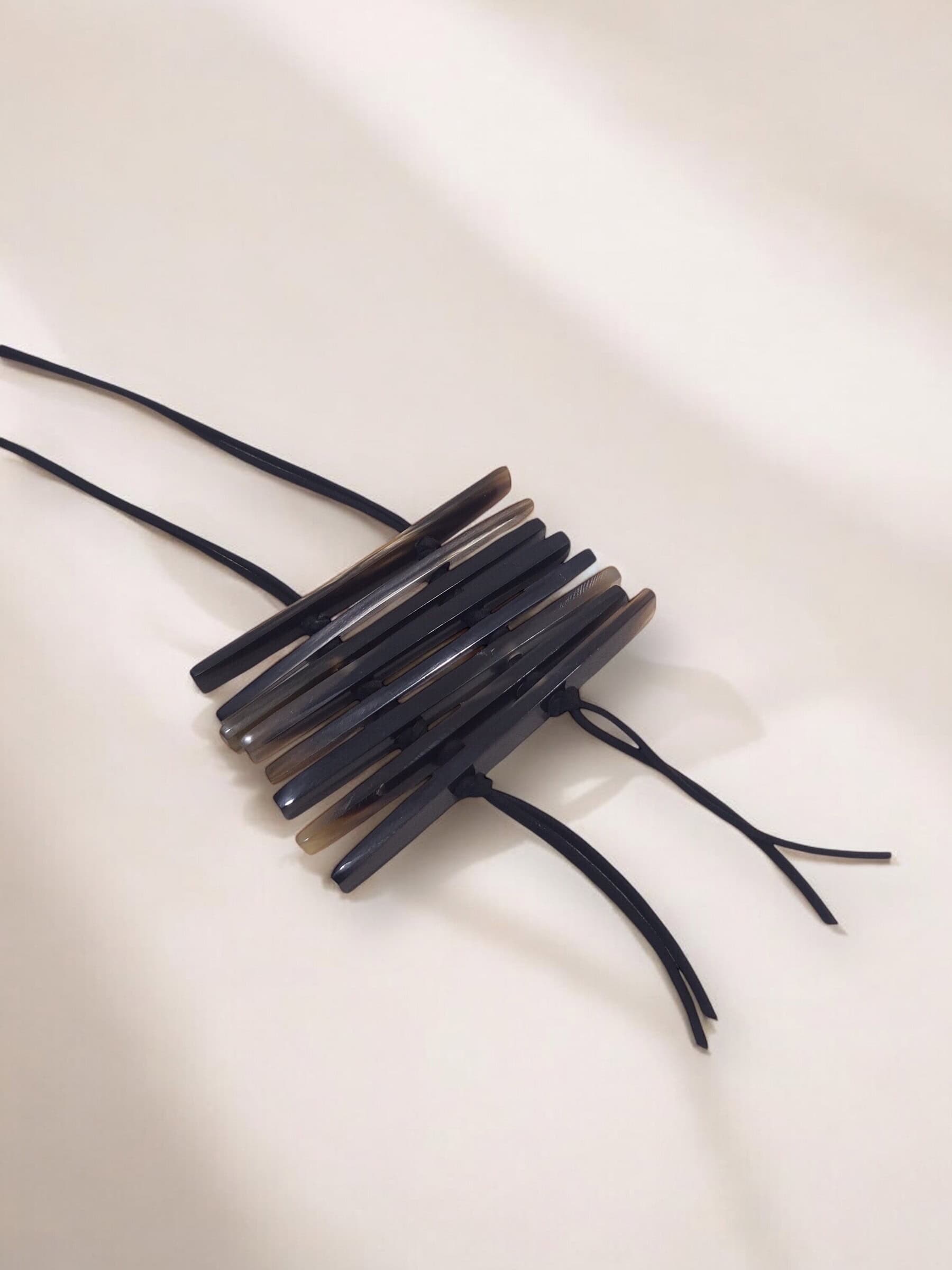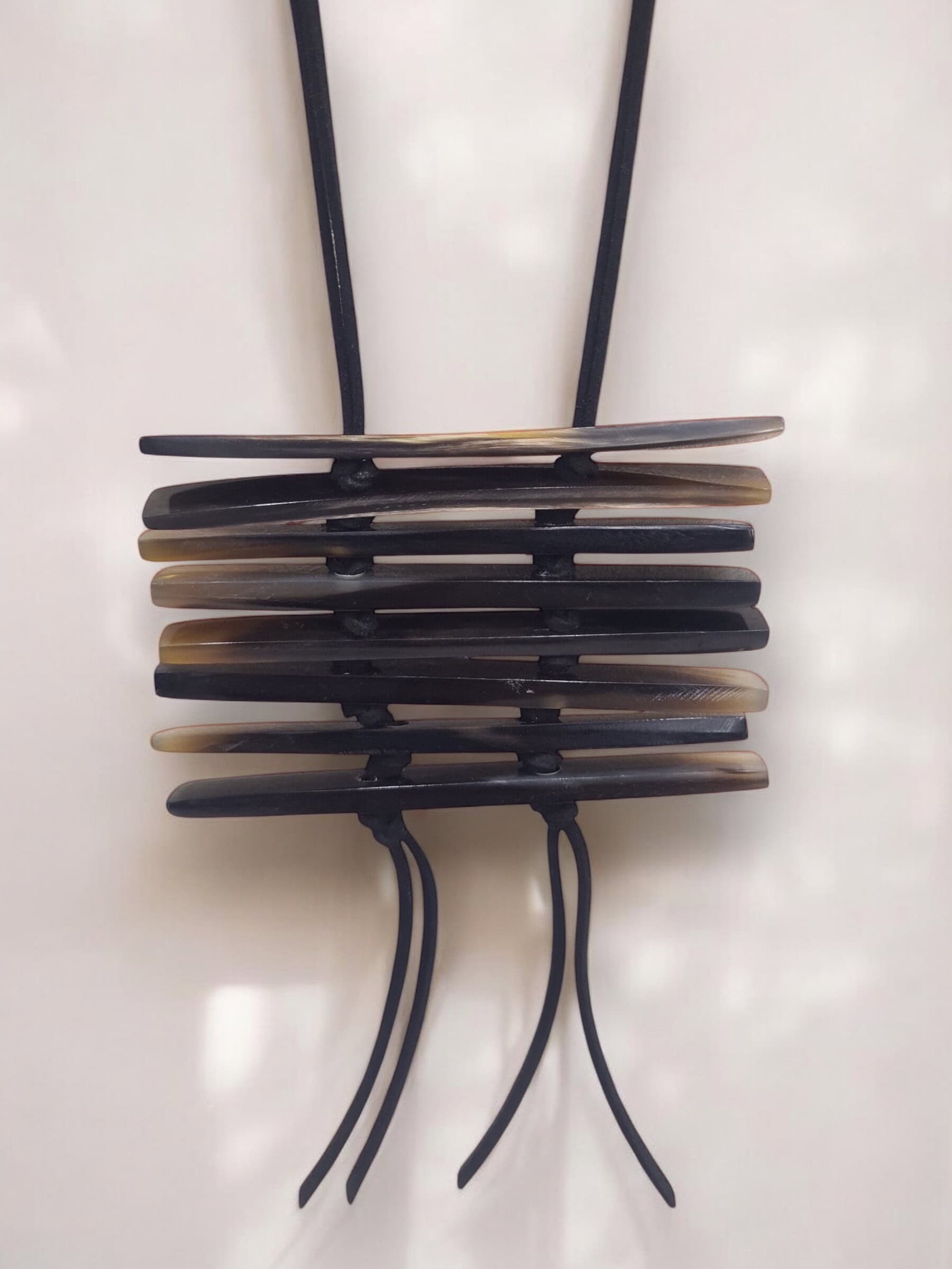 Collar largo hecho a mano en cacho de toro reciclado. La belleza del material y el trabajo fino artesanal dan como resultado una pieza única y sostenible.