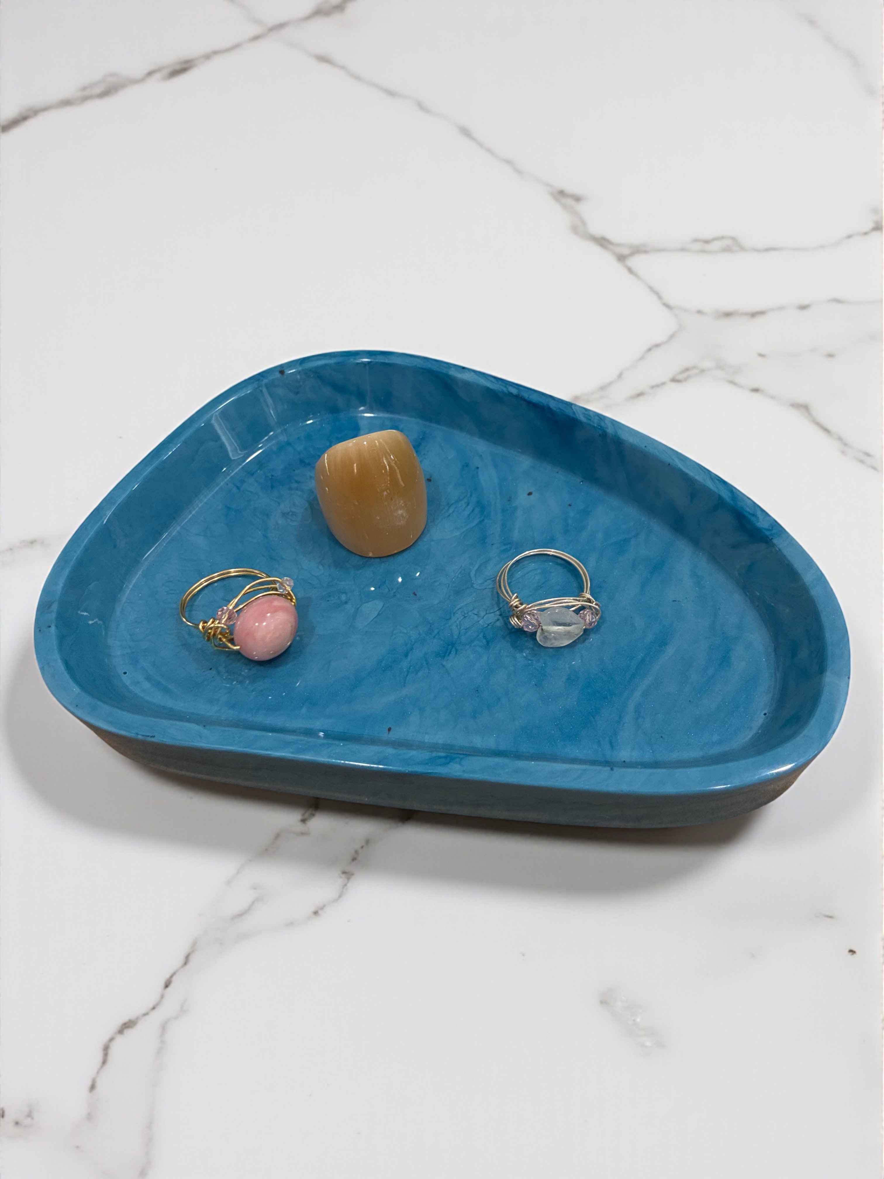 Joyero o jabonera de forma orgánica, hecha a mano en resina con acabado brillante. Ideal para guardar anillos, aretes, llaves o monedas. Es una pieza ligera, resistente y de fácil limpieza, perfecta para aportar un toque moderno y artesanal.