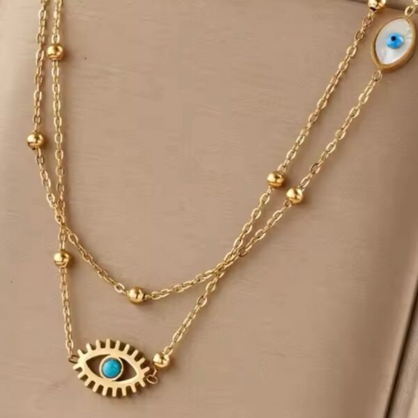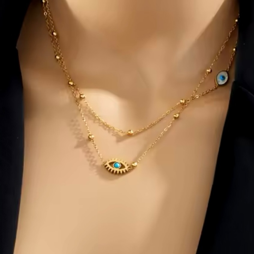 Collar doble en acero inoxidable con dijes de ojo turco, símbolo de protección y buena energía, ideal para un look elegante y significativo.