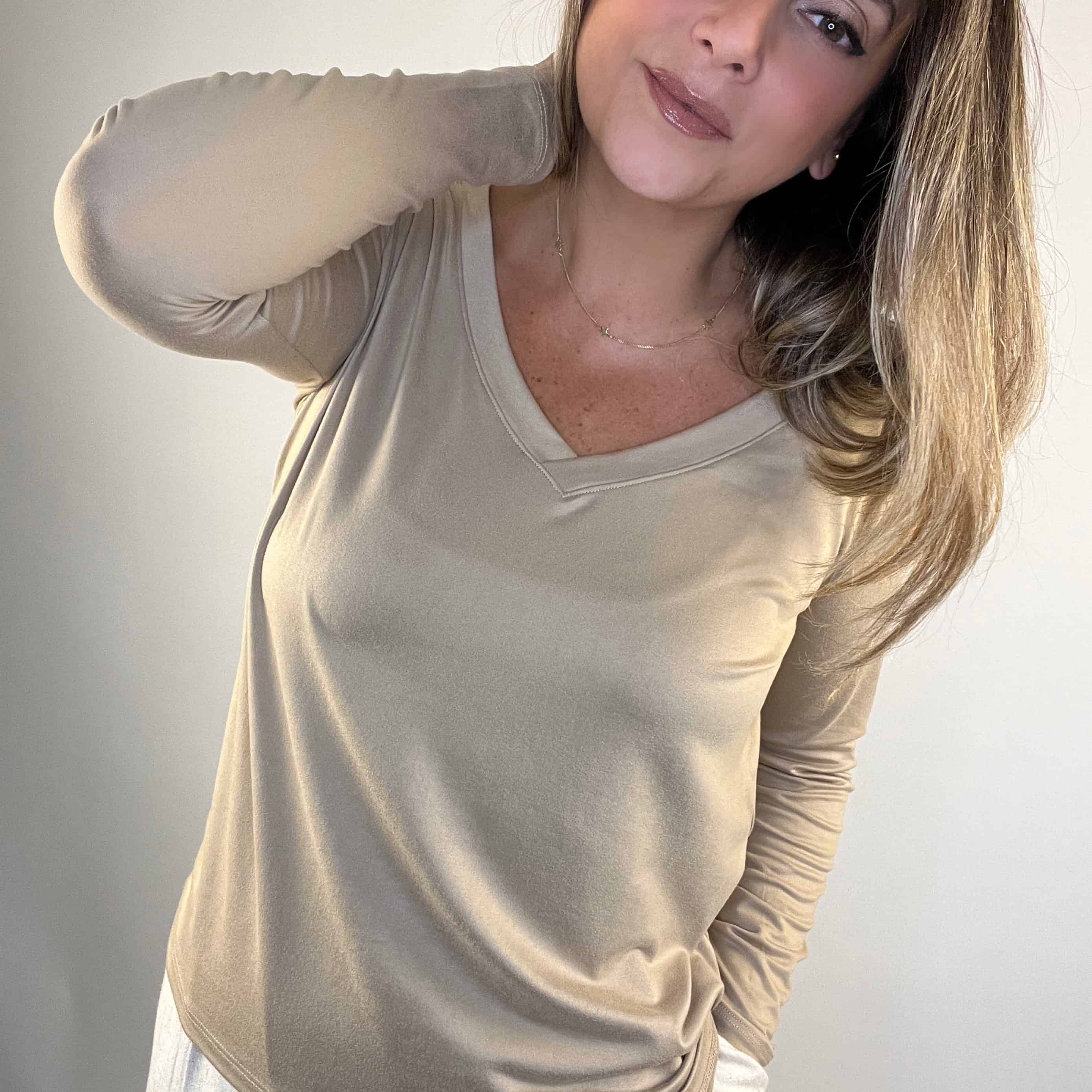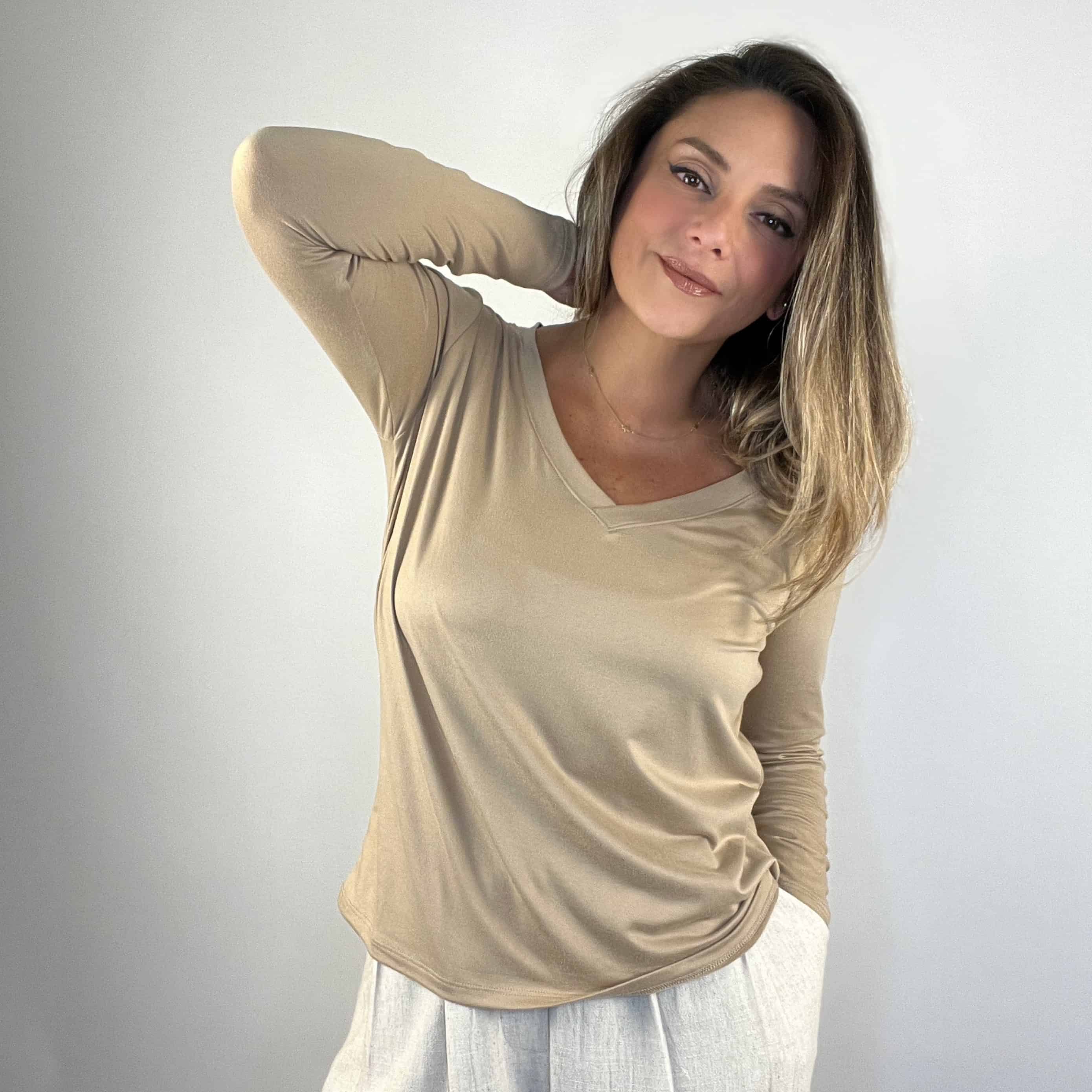 Top hecho de 100% algodón pima. Súper suave y ligero, con cuello en V y manga larga. ¡Se siente como una segunda piel!