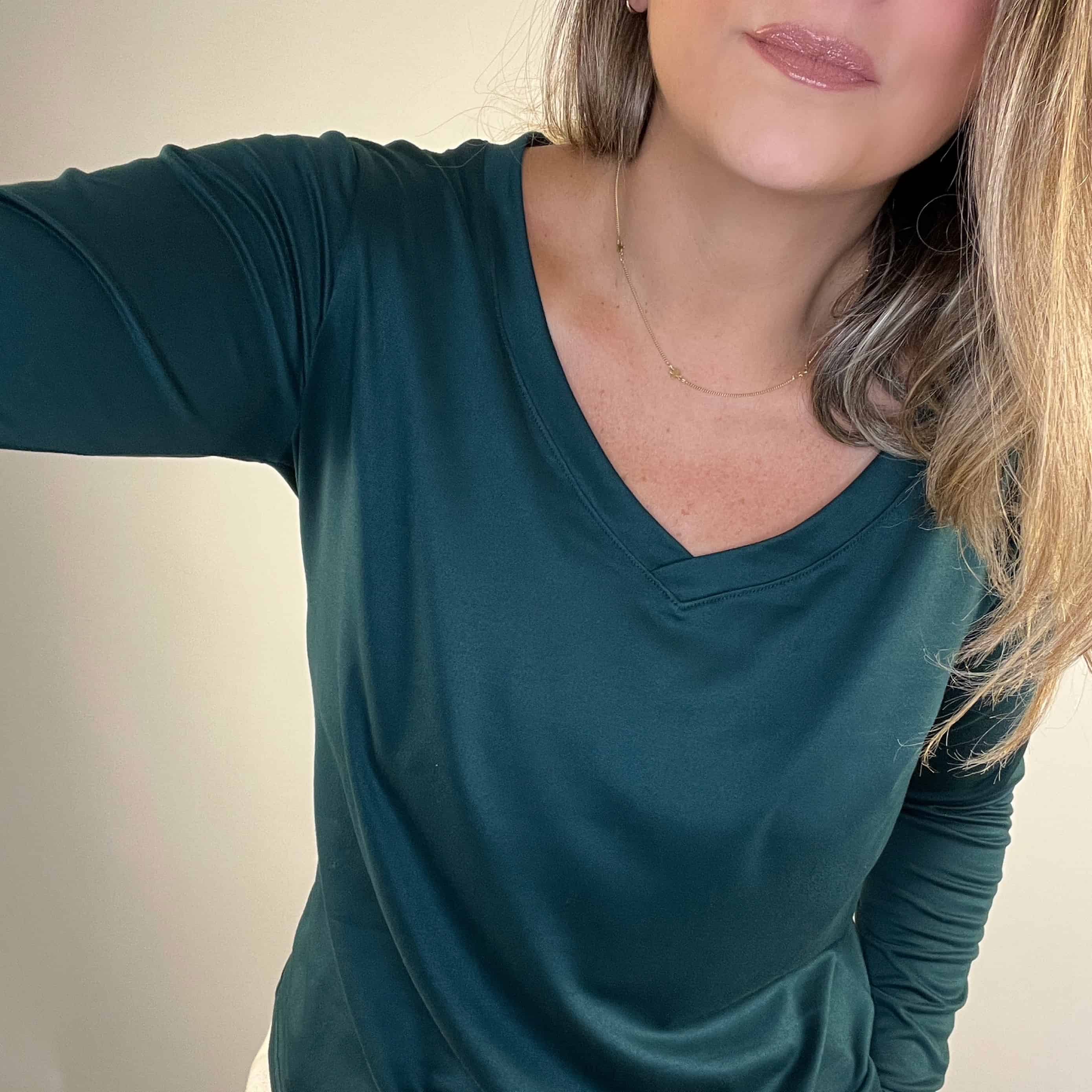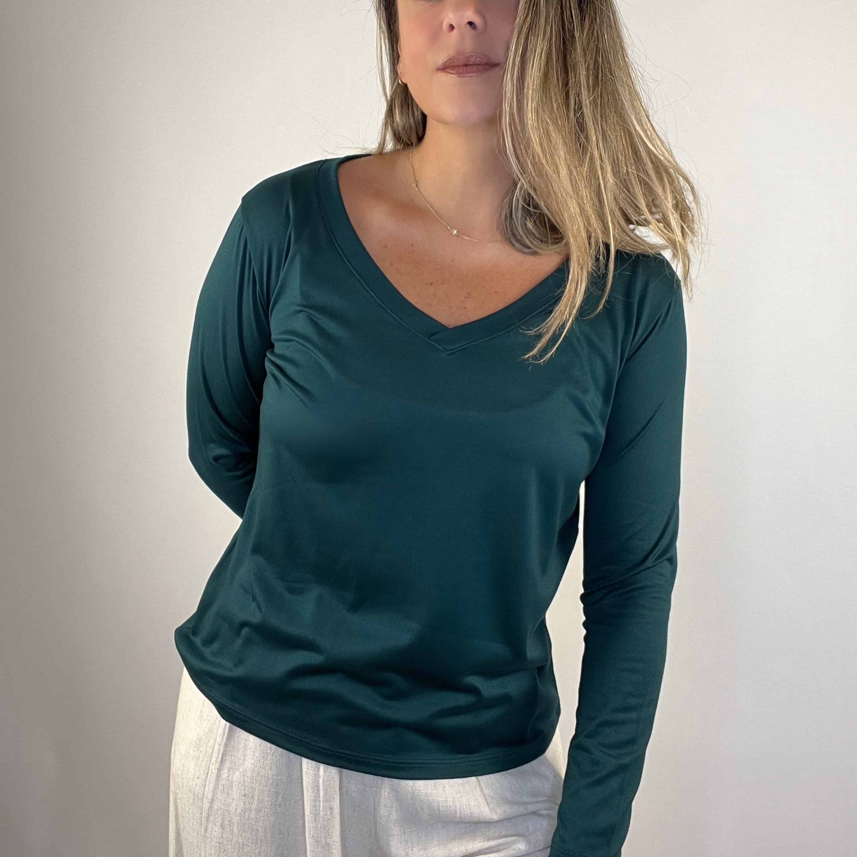 Top hecho de 100% algodón pima. Súper suave y ligero, con cuello en V y manga larga. ¡Se siente como una segunda piel!