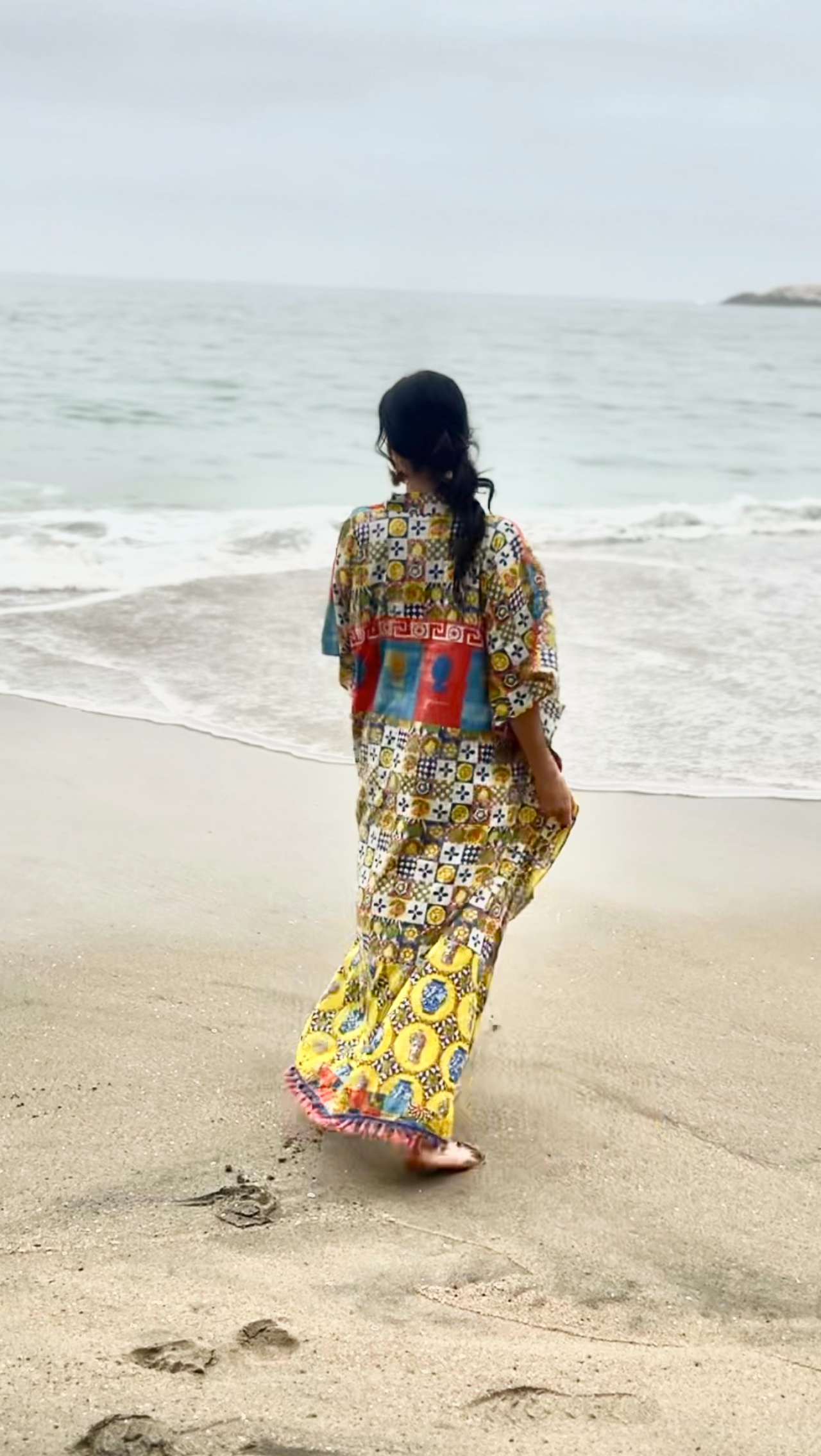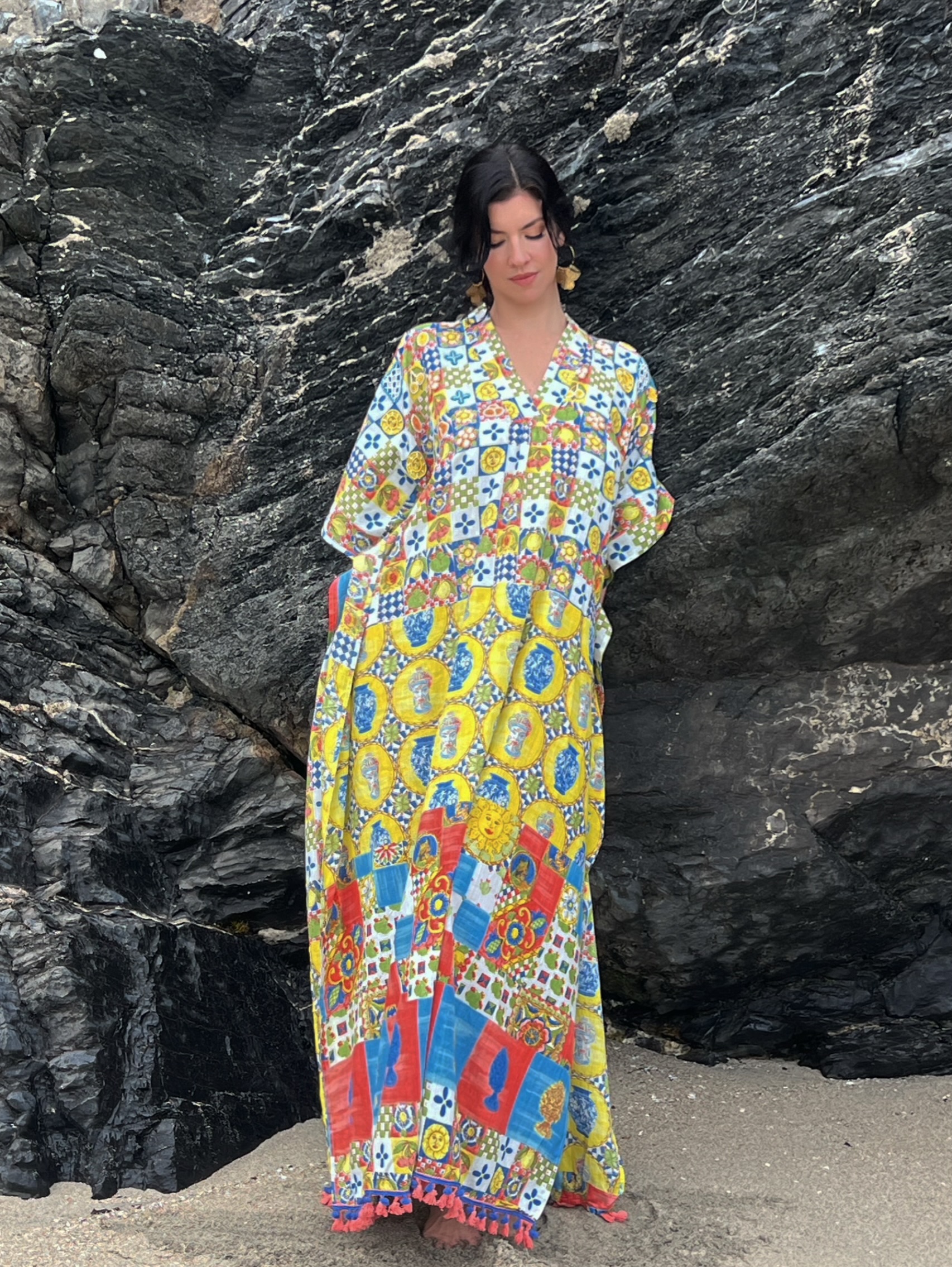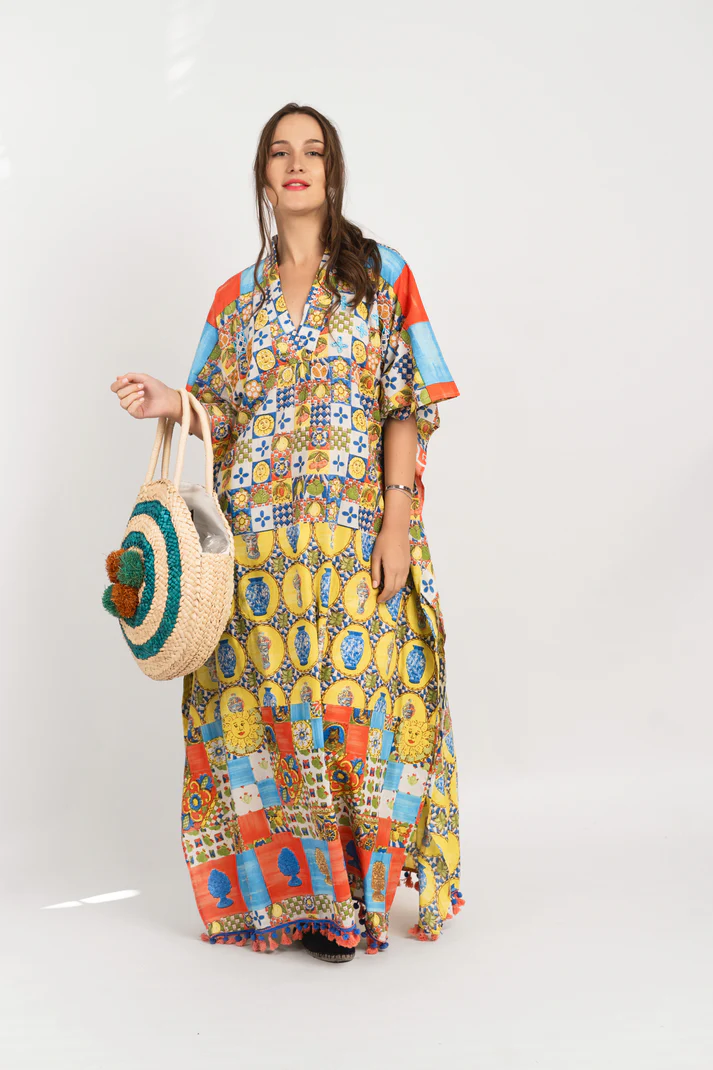 Diseño, confección y tela italiana. Kaftán largo con estampado y cuello en V. Su silueta amplia y fluida brinda frescura y comodidad, ideal para días de playa o para un look relajado y veraniego. Detalles decorativos en el borde añaden un toque artesanal y distintivo.