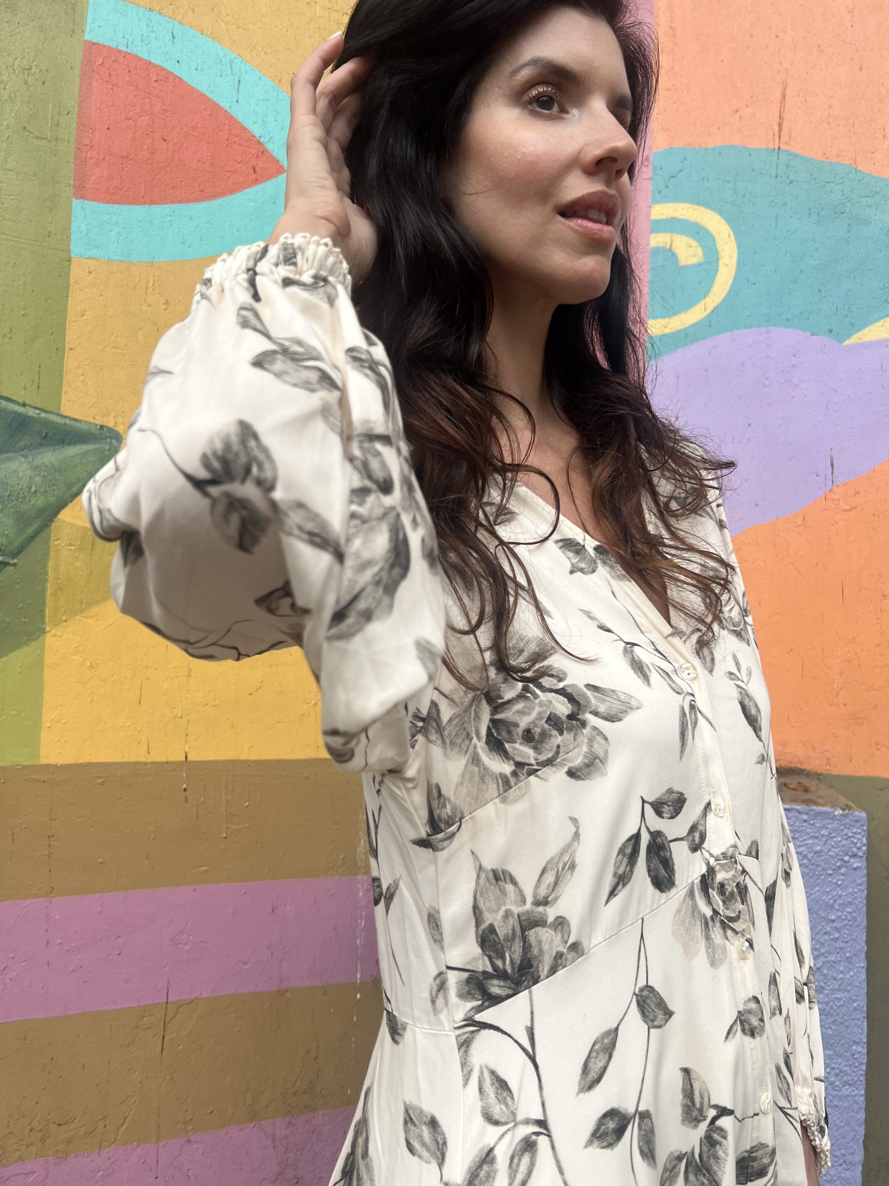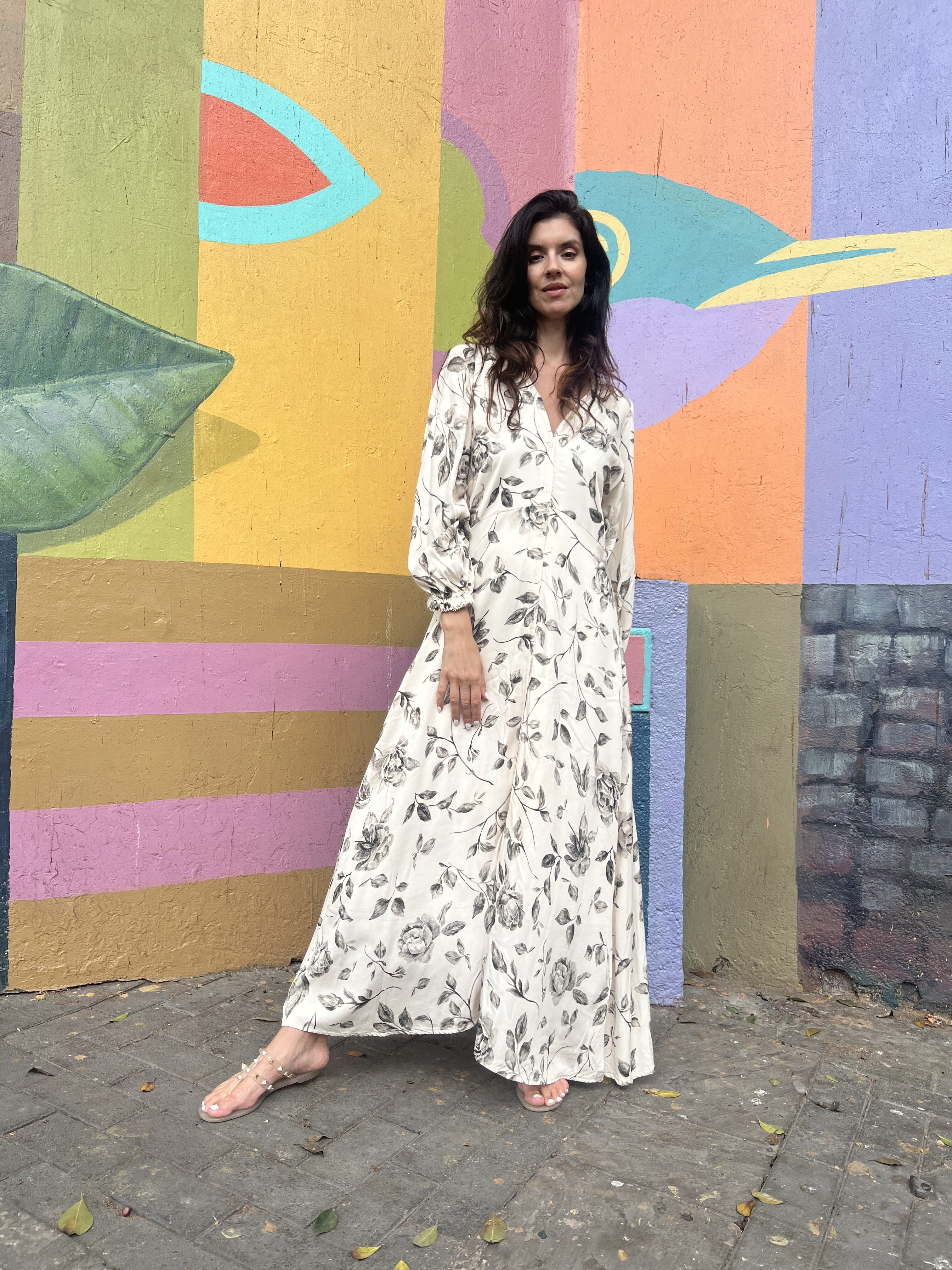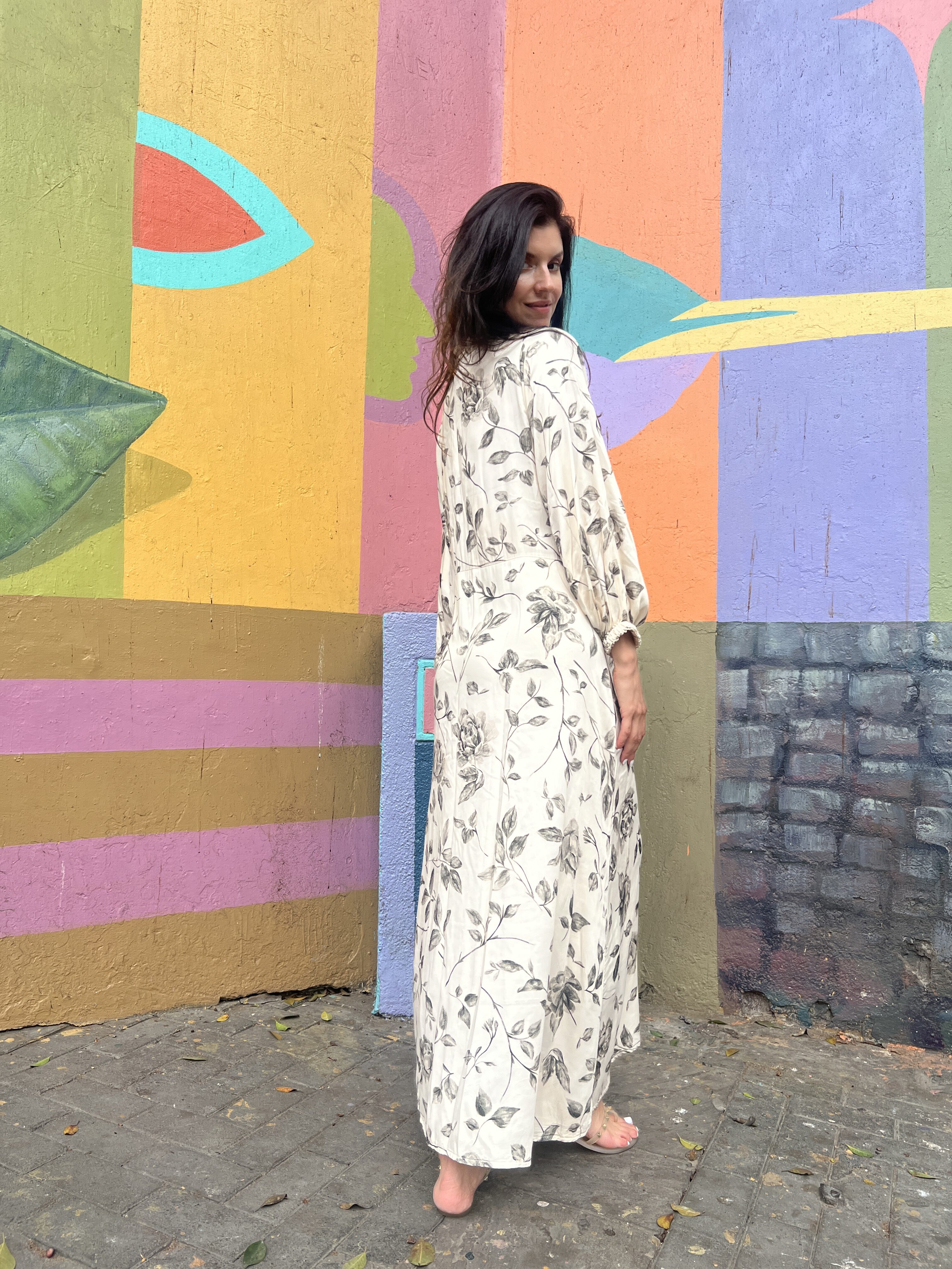 Vestido largo, tiene mangas ajustables que te permitirán sentirte cómoda y ligera. Detalle de botones de concha de nácar, perfecto para las amantes de la moda relajada y sofisticada, pues su diseño fluido es ideal para cualquier ocasión, desde una salida casual hasta un evento semi-formal.