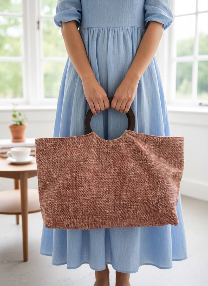Maxibolso en algodón de textura suave, con asa circular de madera que aporta un toque sofisticado y moderno. Su diseño amplio lo hace práctico y cómodo para uso diario.